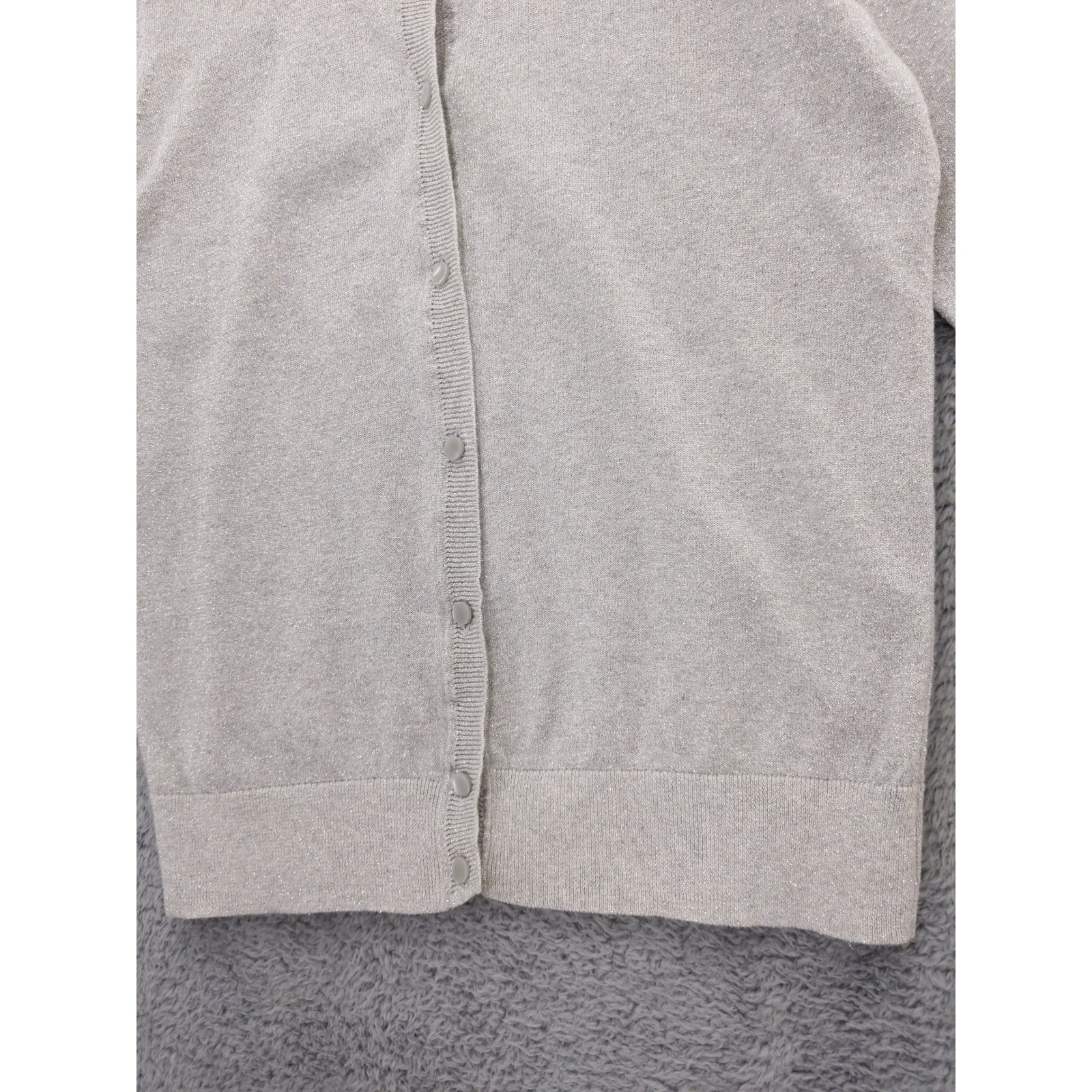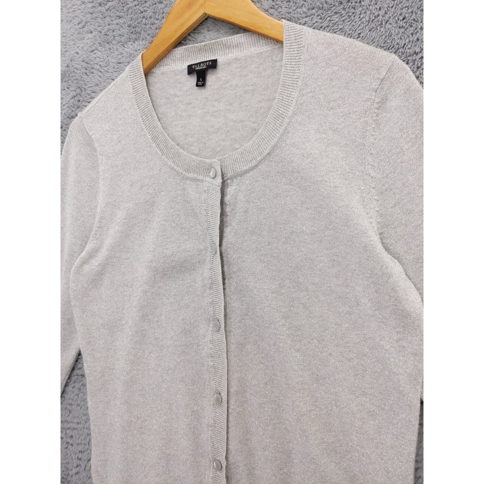 Talbots womens cardigan sweater in a silver sparkle knit. This stylish piece features a classic button-front closure and long sleeves. The knit fabric offers a subtle shimmer, adding a touch of elegance to any outfit. Measurements: • Chest Across - 18 in • Neck to Hem (Back) - 24 in Excellent used condition with no holes, tears, heavy wear, or stains.
