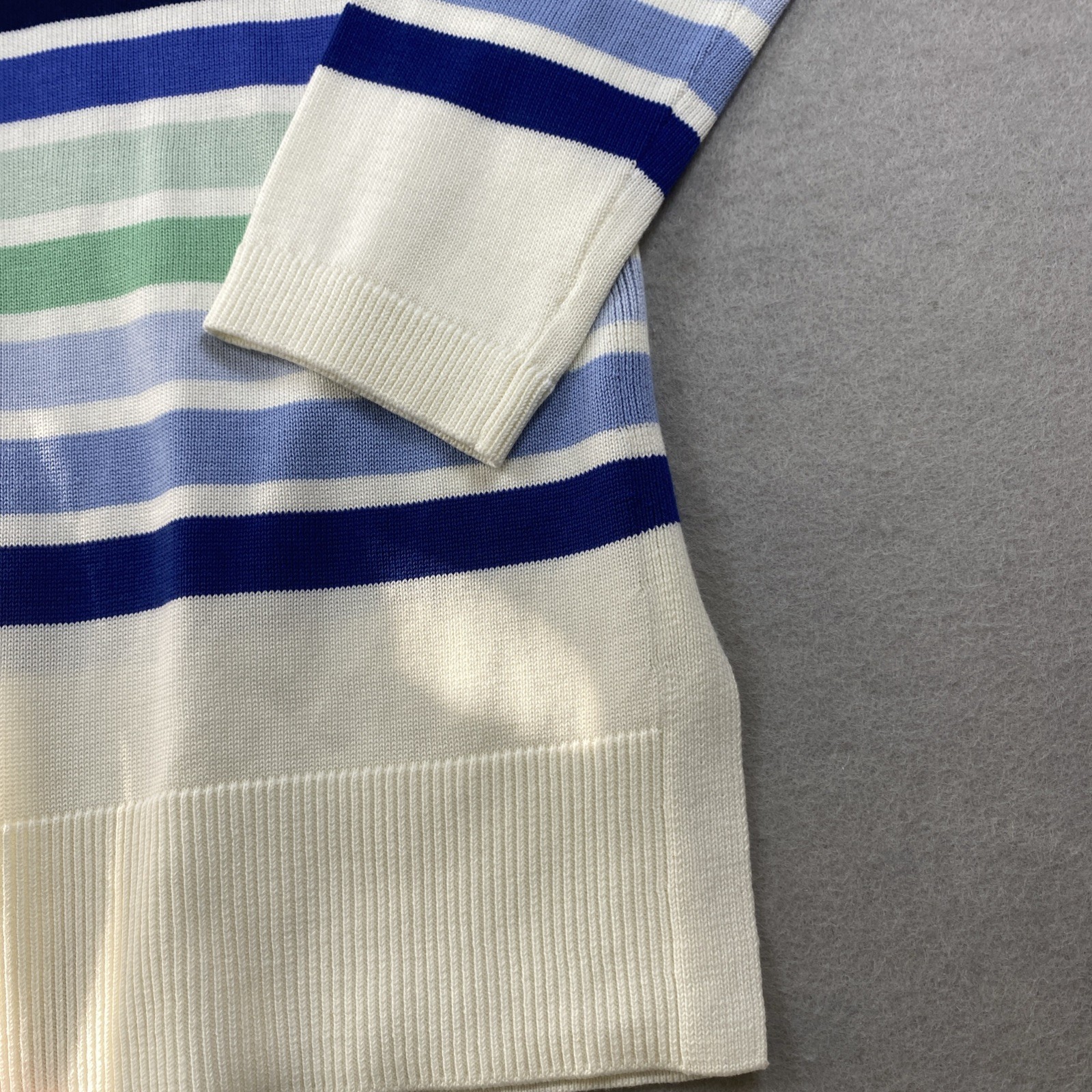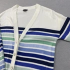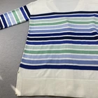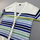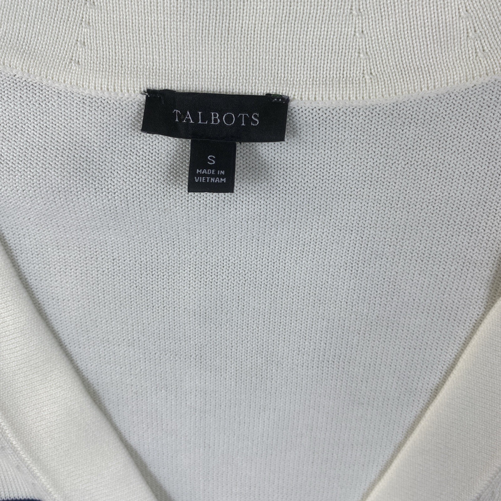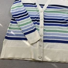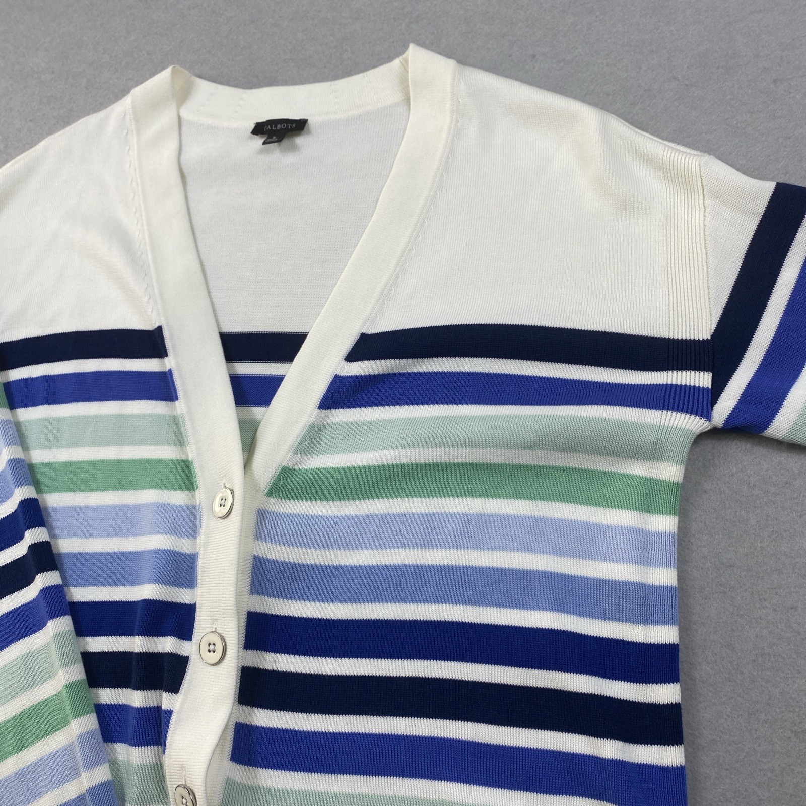 This Talbots Women's Cardigan Sweater in size small features a classic striped pattern with a button-front design and knit construction, making it perfect for casual occasions. Made from a blend of rayon and cotton, this sweater is machine washable and has a comfortable regular fit. The blue color and nautical theme add a touch of style, making it a versatile piece for the winter, fall, and spring seasons. WB19