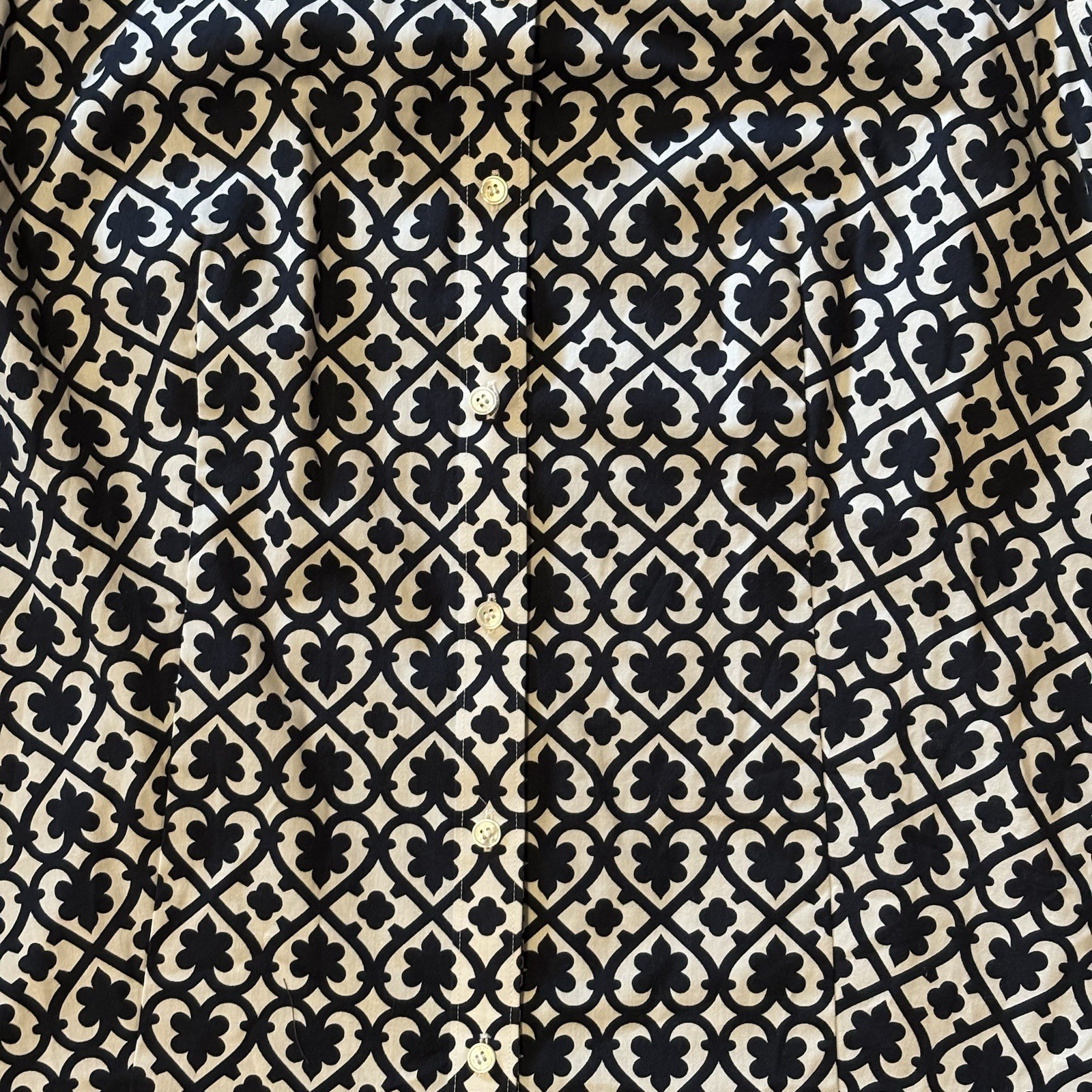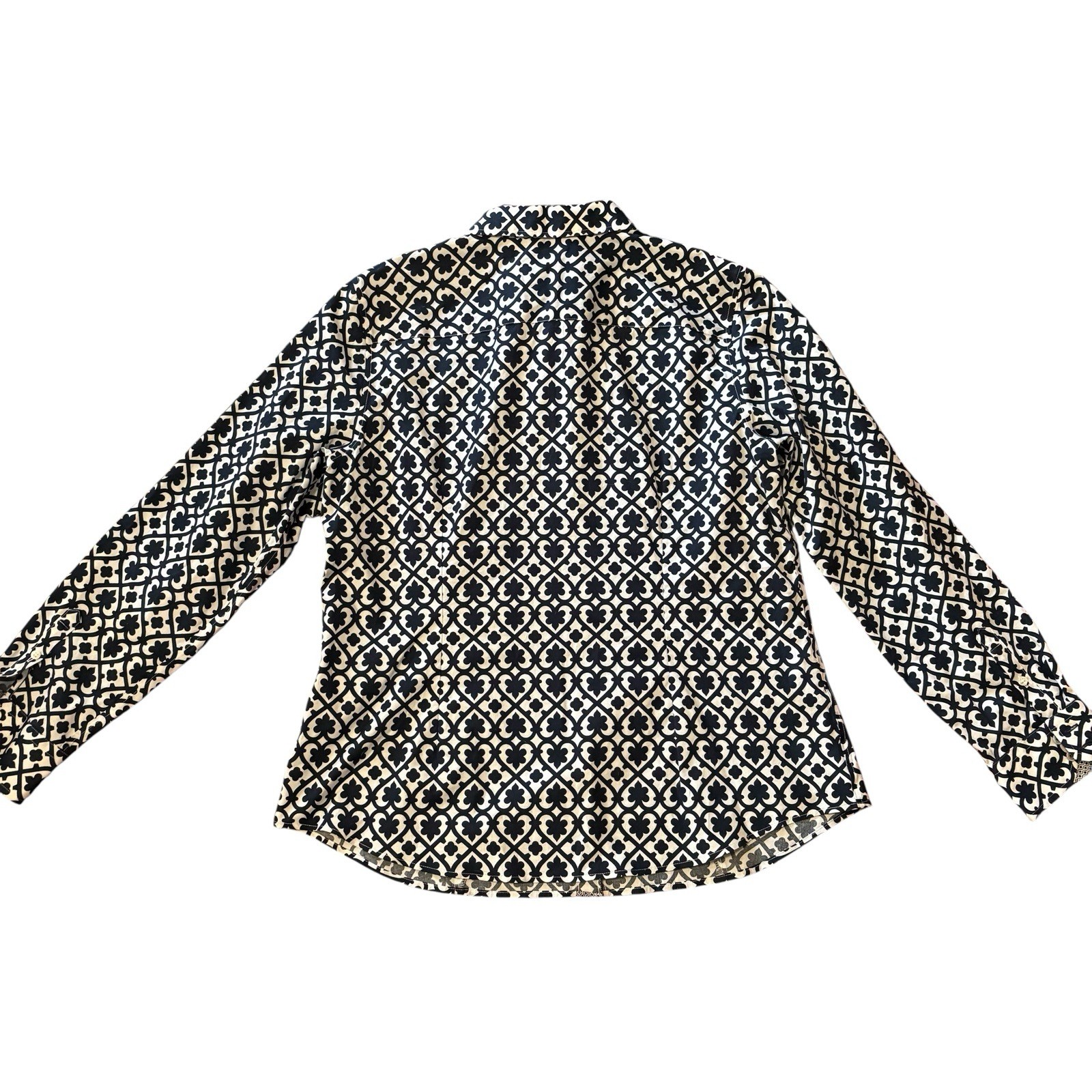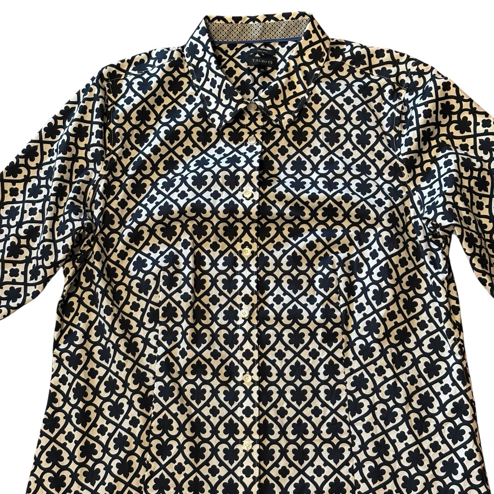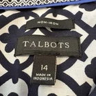 The Talbots Women’s Non Iron Perfect Shirt in size 14 features a stylish navy blue and white geometric pattern, perfect for various occasions such as travel, casual wear, workwear, or business meetings. Made from a comfortable cotton blend fabric, this shirt offers long sleeves, a collared neckline, and a button closure for a classic and polished look. With its non-iron feature, this shirt is convenient for the busy woman on the go, making it a versatile and practical addition to any wardrobe.