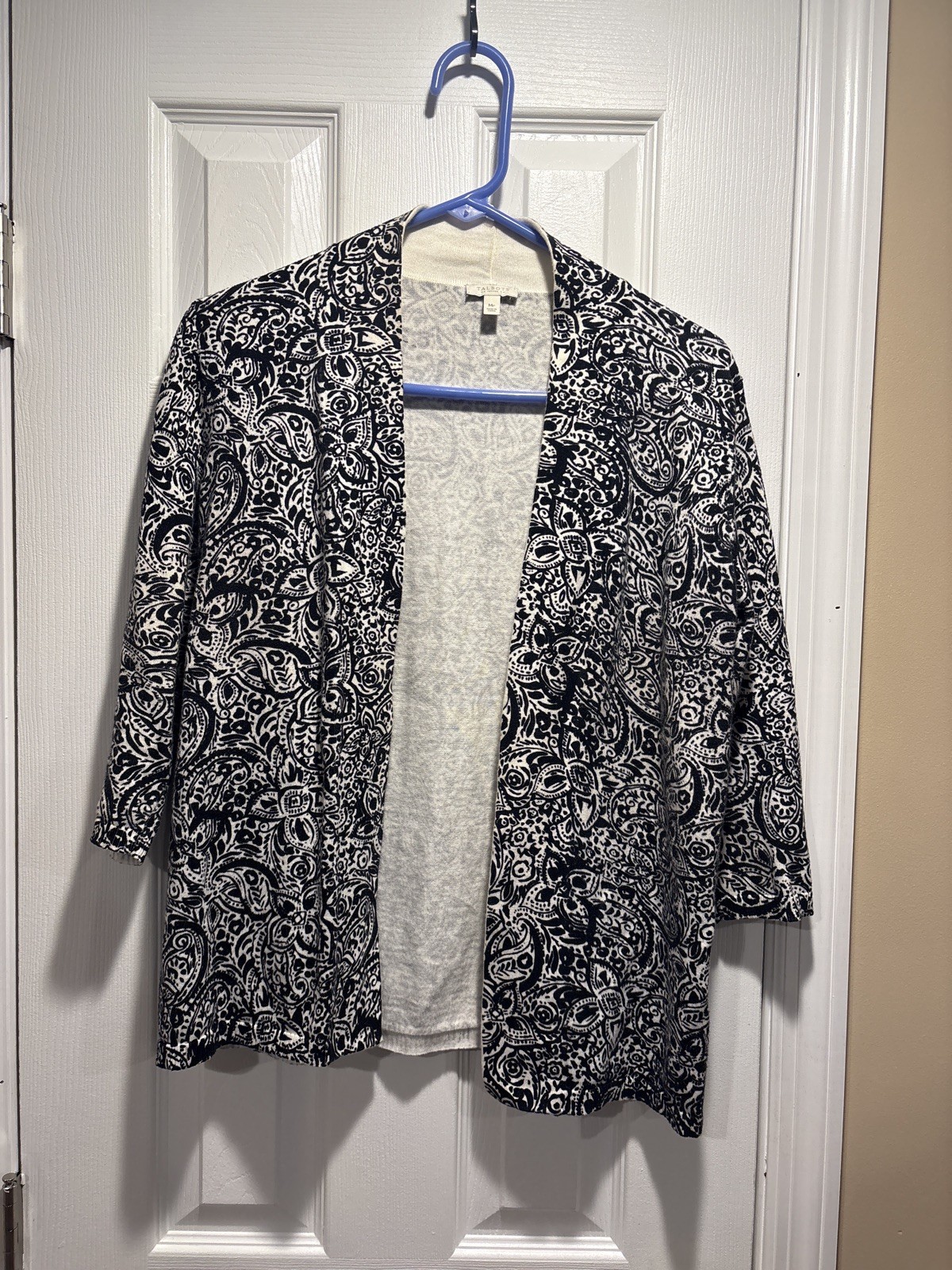 Elevate your wardrobe with this classic Talbots Petites open-front cardigan. Features a black and white paisley knit pattern with 3/4 length sleeves and a lightweight feel — perfect for layering in any season. The versatile, timeless design makes it ideal for both casual and office wear. Details: • Brand: Talbots Petites • Size: MP (Medium Petite) • Color: Black & White • Style: Open Front Cardigan • Pattern: Paisley • Sleeve Length: 3/4 Sleeve • Material: Soft knit blend (likely cotton or rayon/nylon blend) • Condition: Excellent preowned condition, no flaws noted