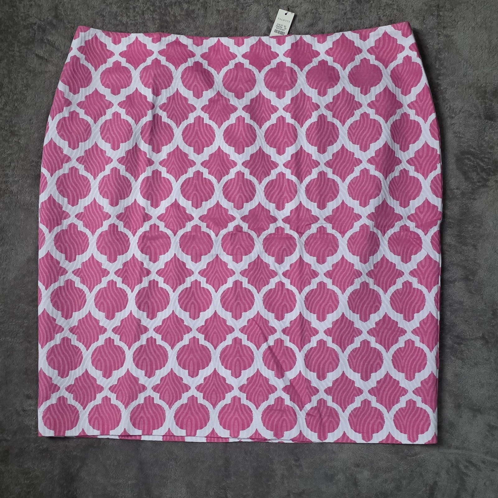 This Talbots Women's Pink and White Geometric Print Textured Pencil Skirt in size 20 is a stylish and versatile piece for workwear. Made from 100% cotton with a dark fabric wash, it features a knee-length straight and pencil style with a geometric pattern in pink and white. This skirt is easy to care for with machine washable instructions, making it a practical and fashionable choice for the spring season. The zip closure adds a practical touch to this classic-themed piece from a trusted brand like Talbots.