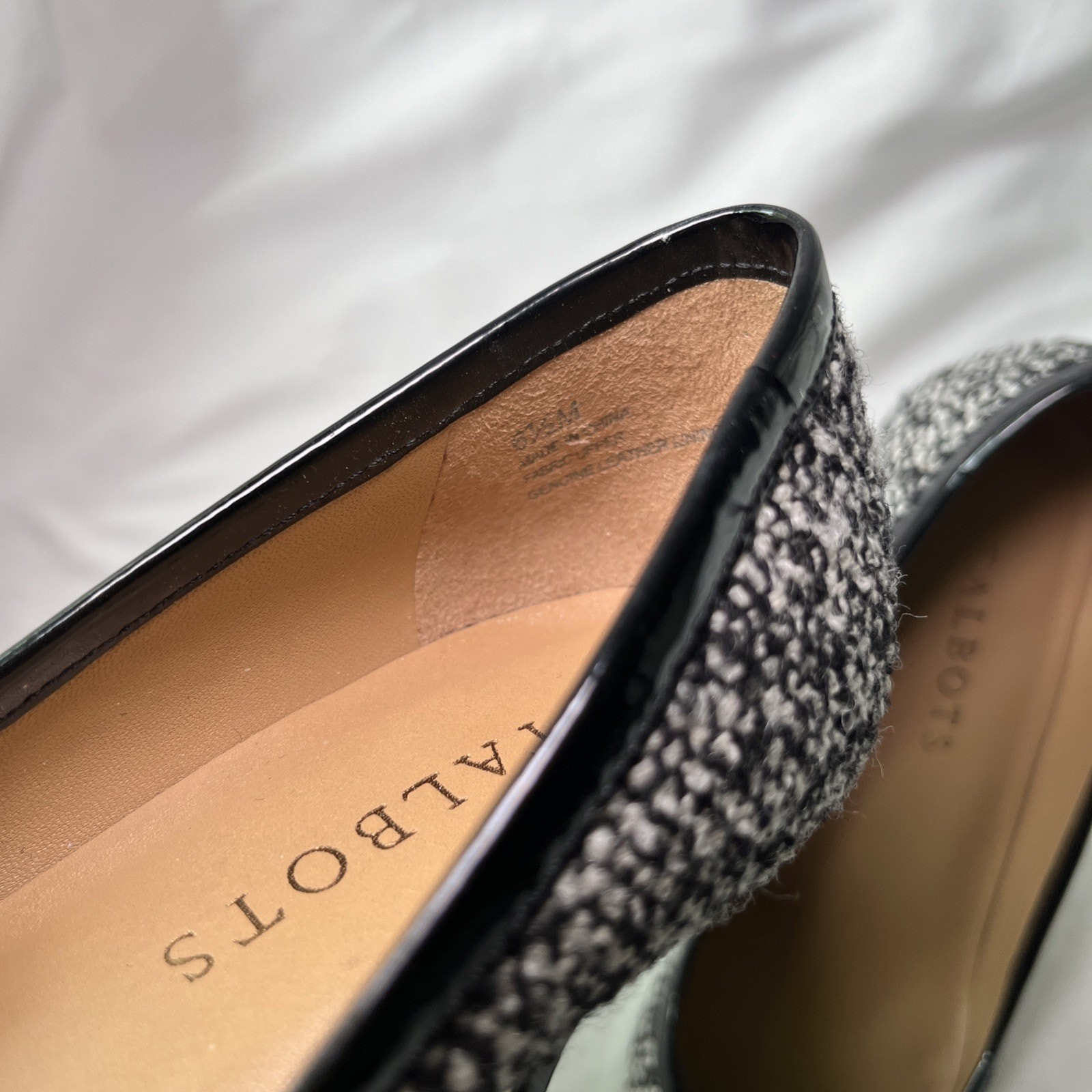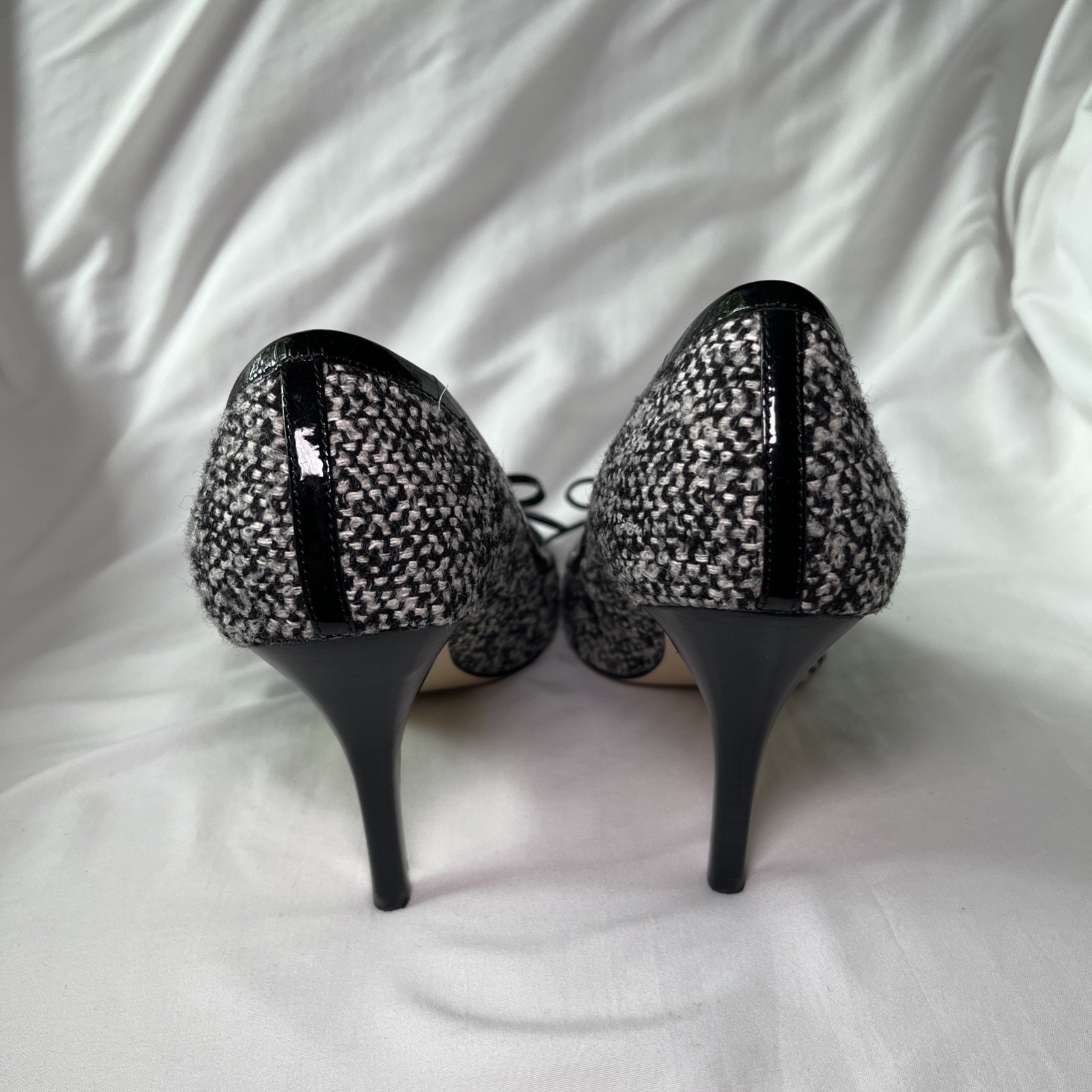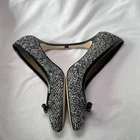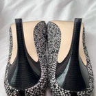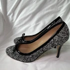 These Talbots Women's Pumps are a stylish and versatile pair of black and white knit heels with leather inner and soles, perfect for various occasions such as travel, weddings, parties, and business meetings. The mid heel height and slip-on closure provide comfort and ease of wear, while the bow accent adds a touch of sophistication. Made with high-quality materials and featuring a classic yet trendy design, these pumps are a wardrobe staple for any woman looking to make a stylish statement at work or for a night out. Excellent condition.