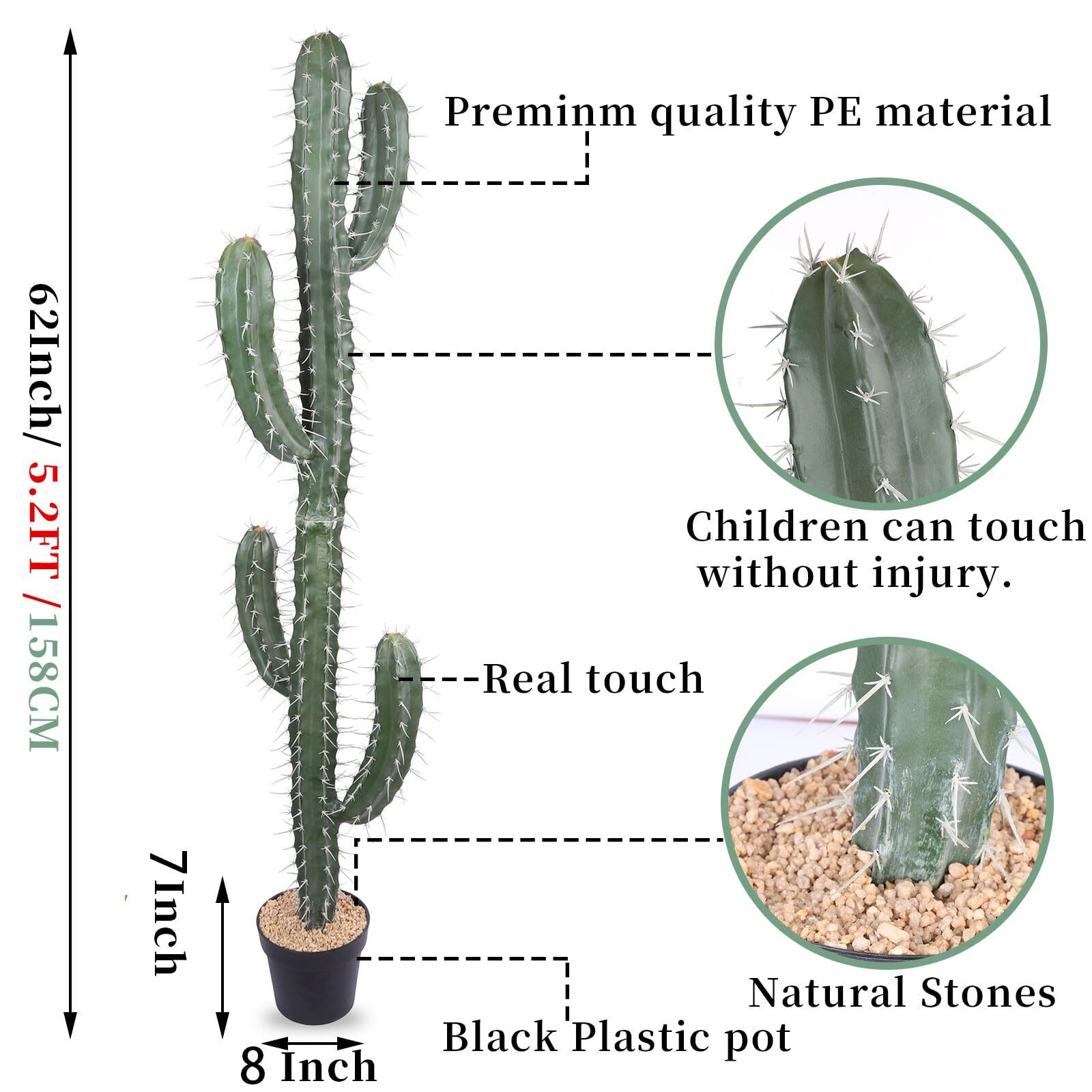 【Great Choice for Decoration】: The height of the artificial cactus is 62". The base is black plastic pot. Unlike real plants, our artificial cactus will not cause allergies. Realistic texture and lifelike color, is a great option to fill an empty space around you. 【Cute&Realistic】: Artificial Cactus no needs to be reshaped when you remove it from the box. you can put them into the way you prefer.Our artificial cactus indoor can be washed easily with water and is durable enough to be used for a long time. 【Realistic Detail】: To create a more realistic look, artificial cactus are made in varying color gradation, vein pattern, and shape, with high quality materials, sophisticated craftsmanship.It is a very full realistic artificial cactus. Looks great in living room, looks better in day light. 【No Maintenance】: Artificial cactus is a great way to add softness and style without having to add maintenance time into your schedule. Our artificial cactus do not have to water and no dead leaves. It has a strong and lasting vitality. It is a perfect solution for many busy professionals who don't have the time or energy to take care of real plants. 【Attractive artificial cactus】: Artificial cactus are all the rage in interior and exterior decor. Perfect for entryway, front porch, living room, dining room, bedroom, farmhouse, home, office or anywhere you want to add a charming touch of greenery. Decorating any corner with our faux plants can add greenery into your space.
