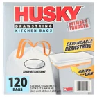 Husky 13 Gallon Drawstring Unscented Tall Kitchen Bags resist tears and punctures so you can transport your kitchen waste to the curb with confidence. These 24 inch by 27 inch kitchen bags fit most standard-size kitchen trash cans. Manufactured with high quality expandable drawstring which grips the can, keeping it in place. 120 bags per box. Manufactured with 20% post-consumer recycled content. Husky 13 gal 120 count 24" x 27" 0.8 mil thickness One-by-One dispensing Unscented Manufactured with 20% post-consumer recycled plastic Great for residential, indoor trash