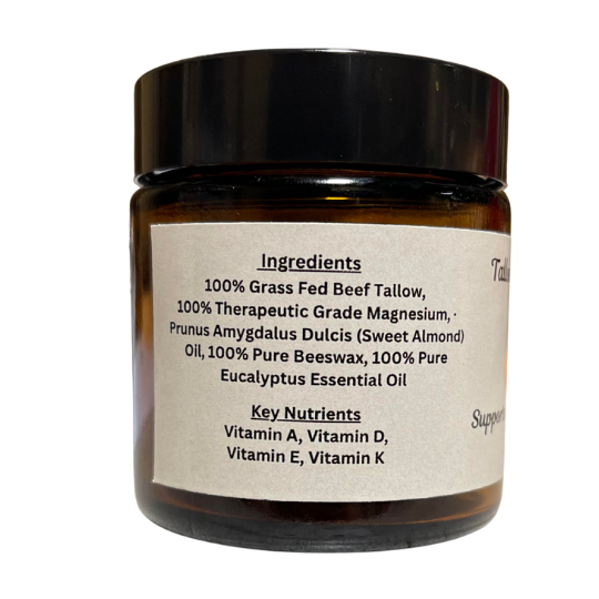 πΏ Tallow, Magnesium & Eucalyptus Body Cream Nourish. Soothe. Revive. Indulge your skin with our Handcrafted Tallow, Magnesium & Eucalyptus Body Cream , made with natureβs most powerful ingredients β grass-fed tallow, magnesium oil, beeswax, and sweet almond oil . This rich, creamy formula deeply moisturizes, soothes tired muscles, and promotes overall skin wellness, all while providing the refreshing, clean scent of eucalyptus. Perfect for anyone looking for a natural, toxin-free alternative to commercial lotions, our body cream absorbs beautifully without leaving a greasy residue β just soft, healthy, radiant skin. π Key Ingredients & Their Benefits π Grass-Fed Tallow Rich in vitamins A, D, E, and K, tallow closely resembles the natural oils of your skin. It helps restore the skin barrier, improve elasticity, and lock in long-lasting hydration. π§ Magnesium Known for its soothing and anti-inflammatory properties, magnesium helps ease muscle tension, reduce stress, and support overall skin health. Ideal for post-workout recovery or relaxation before bed. πΏ Eucalyptus Essential Oil Energizing and purifying, eucalyptus provides a refreshing scent while promoting circulation and helping to soothe sore muscles or tired skin. π Natural Beeswax Creates a gentle protective barrier that seals in moisture without clogging pores β keeping skin soft and hydrated all day long. πΈ Sweet Almond Oil Lightweight and packed with antioxidants, sweet almond oil nourishes and softens skin while helping to improve tone and texture. β¨ Why Youβll Love It β Deep, non-greasy hydration for dry or sensitive skin β Naturally rich in vitamins and minerals β Supports muscle relaxation and recovery β Helps soothe irritation, redness, and inflammation β Clean, invigorating eucalyptus scent β Made with 100% natural, skin-safe ingredients β Free from parabens, sulfates, and synthetic fragrances πΌ How to Use Massage a small amount onto clean, dry skin β especially after a shower or bath. For sore muscles, apply generously to target areas and allow the magnesium and eucalyptus to work their magic. π« Experience the Power of Nature-Infused Skincare Our Tallow, Magnesium & Eucalyptus Body Cream is handmade in small batches with care β blending the nourishing power of traditional tallow with the modern benefits of magnesium and pure essential oils. Your skin will thank you for the natural moisture, balance, and soothing relief it brings. π Shop now to experience naturally restored, refreshed, and radiant skin! INGREDIENTS: 100% Grass-fed Beef Tallow, 100% Therapeutic Grade Magnesium Oil, 100% Pure Beeswax, Sweet Almond Oil, 100% Pure Eucalyptus Essential Oil