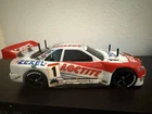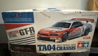 This is the Tamiya Loctite Zexel GT-R (R34) with the TA-04 Chassis. This kit requires some electronics to operate. The body is severely damaged, and some paint pieces are slowly coming off. However, the decals (some of which are also damaged) are still retained. The box is also severely damaged but can still be seen. The item is exactly shown in the images. Thank you for reading!