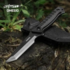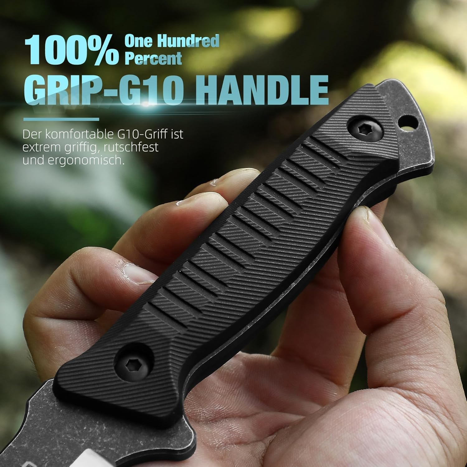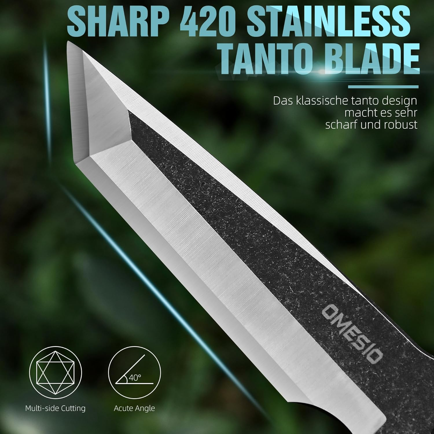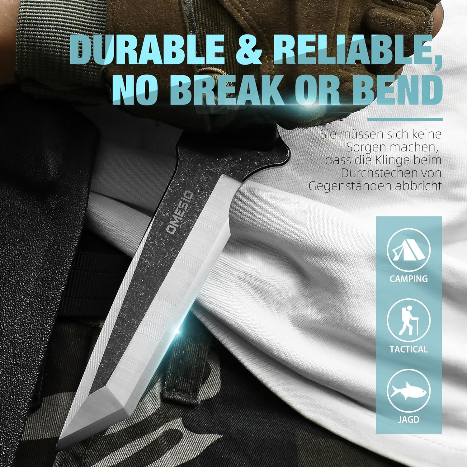 TANTO BLADE DESIGN: Our fixed blade knife with sheath features a distinct and efficient tanto blade design, known for its exceptional piercing ability and durability. HIGH-QUALITY BLADE: Fixed blade knife full tang from dependable 420HC stonewashed steel, the blade offers razor-sharp cutting performance, effortlessly tackling various materials, making every task a breeze. NON-SLIP G10 HANDLE: Black G10 handle with finger guard groove, featuring a textured pattern for a secure grip, non-slip — ergonomic design for exceptional hand control, flexibility, and comfort. MULTI-ANGLE WEARING: Use the horizontal carry knife more safty & portable. Lanyard hole and the high-strength lightweight Kydex sheath with a universal clip can be adjusted horizontally and vertically. The end of handle can be multi-purpose such as glass breaker. MULTI-PURPOSE OUTDOOR KNIFE: This tactical hunting knives excels beyond limits, serving as an indispensable tool for a wide range of outdoor activities, from camping and hiking to survival situations. Product Description Omesio Outdoor Knife - If you're looking for a slightly larger and heavier pointed knife, this is not a problem. - High quality - Crafted with a full tang blade - Sturdy and durable POLYHEDRAL TANTO BLADE Featuring a polyhedral Tanto blade design, our fixed blade tactical knife excels in cutting and piercing tasks, offering versatility for various challenges. ERGONOMIC G10 HANDLE Designed with ergonomics in mind, the G10 handle ensures a comfortable grip and excellent control, enhancing your handling experience. STURDY FULL TANG Built with a sturdy full tang construction, this horizontal carry fixed blade knife provides stability and durability, making it a reliable companion for demanding tasks. SELECTED GIFTS Perfect for both outdoor enthusiasts and knife collectors, it's a carefully selected gift choice that will be truly appreciated. MULTI-PURPOSE OUTDOOR KNIFE Suitable for various outdoor activities, including camping, hiking, and emergency situations. The end of handle can be multi-purpose such as glass breaker. EXCEPTIONAL VERSATILE KYDEX SHEATH The high-strength lightweight KYDEX sheath comes with lanyard holes and a universal clip for both horizontal and vertical adjustments. The detachable and adjustable spacers on the clip are suitable for almost any belt size, ensuring convenient carry.
