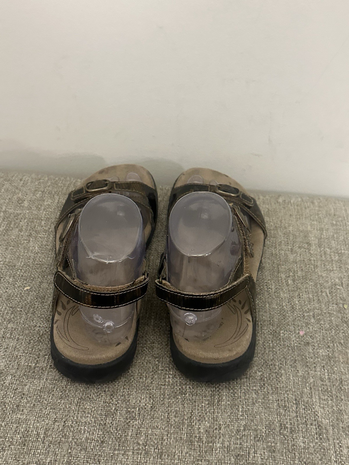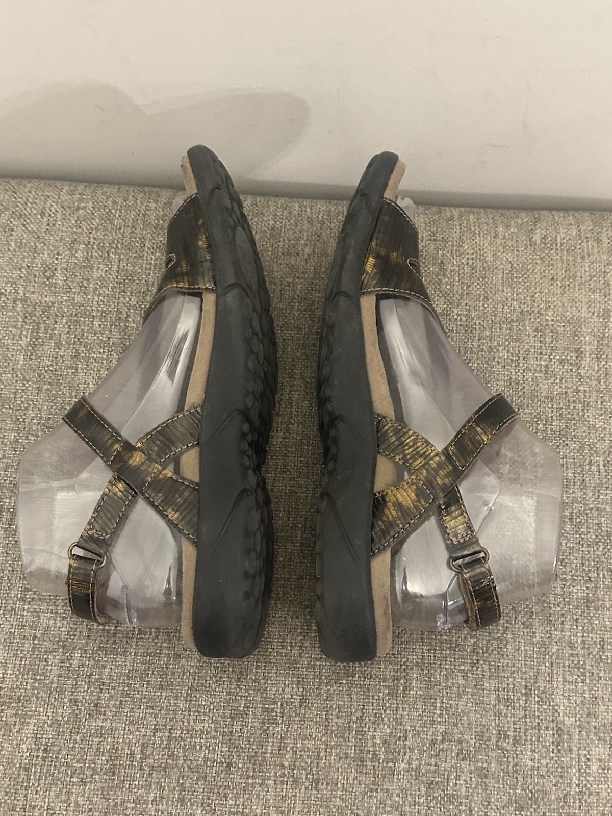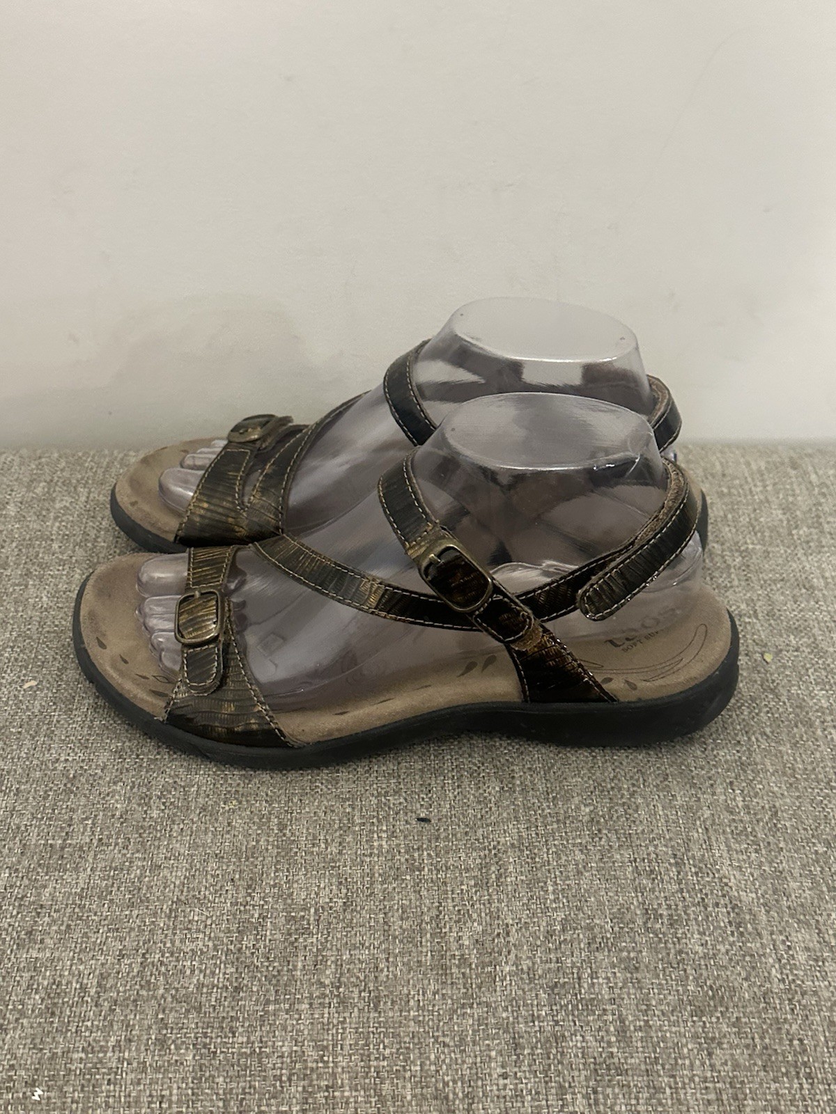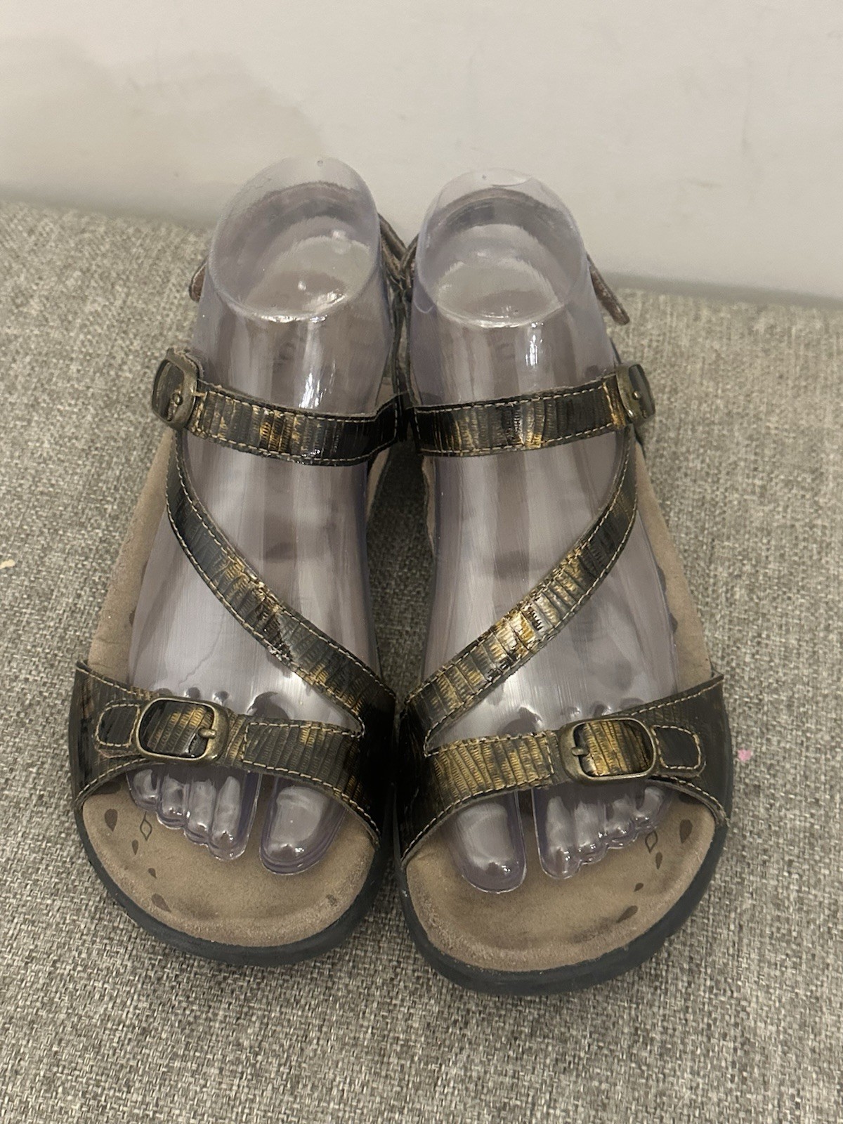 These Taos Women’s Metallic Bronze Slingback Sandals in size 8 are a stylish and comfortable choice for women. The geometric pattern and metallic bronze color add a touch of modern flair to the sandals, while the slingback style offers a secure fit with an adjustable hook and loop closure. The flat heel and standard shoe width provide all-day comfort, and the leather upper material ensures durability and quality. Perfect for any casual or dressy outfit, these sandals from Taos are a versatile and chic addition to any woman's wardrobe. Preowned Good Condition