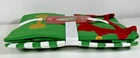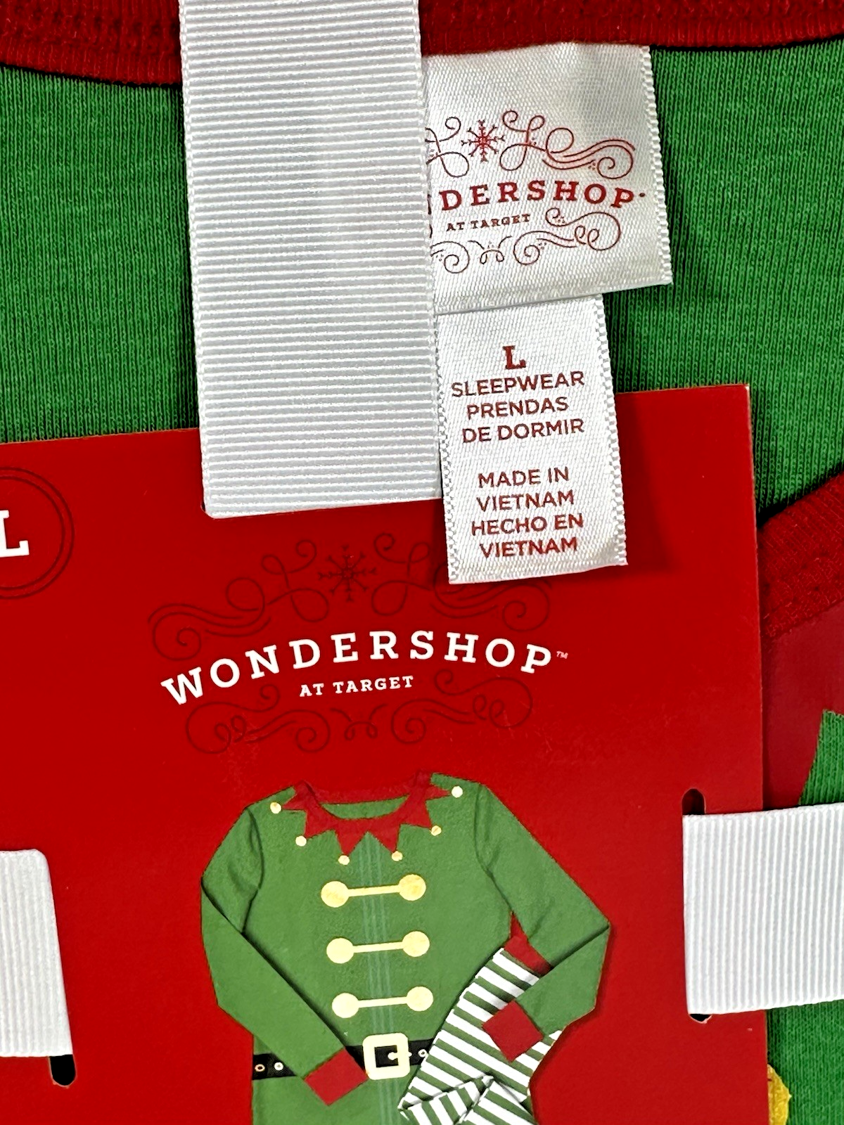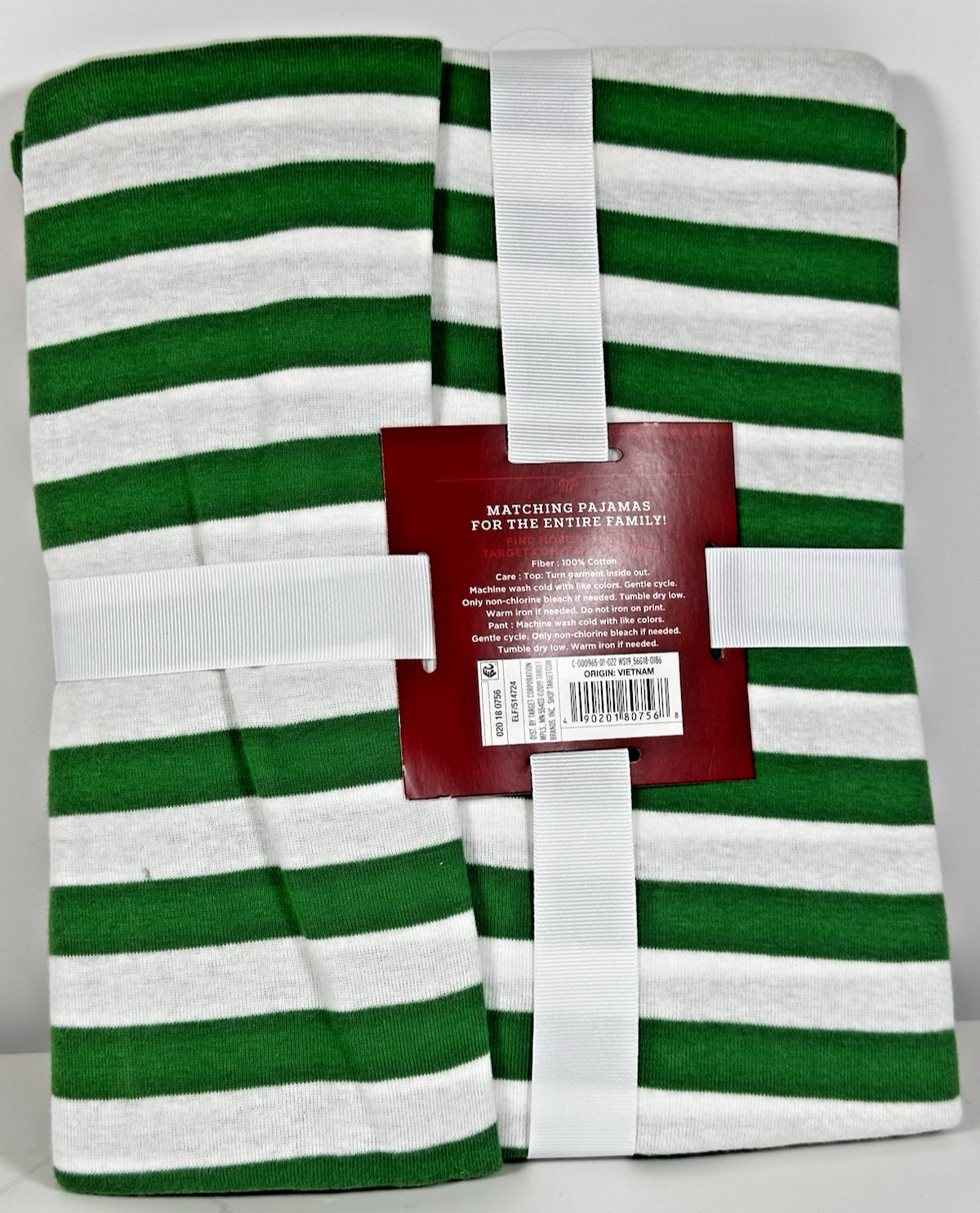 For sale new with tags two piece set of womens pajamas made by Target for the Wondershop product line. This pajama set has a long sleeved top and pull on leggings type bottoms. The top is green with gold bell and buttons printed on the fabric along with a black belt with a gold buckle. The bottoms are green and white striped with red cuffs around the ankles. This set is a women's size large. Machine washable. Details: 100% cotton Made in Vietnam Family pajamas Women's size large Machine washable in cold water gentle cycle Only non-chlorine bleach if needed Warm iron if needed Do not iron on the printed fabric