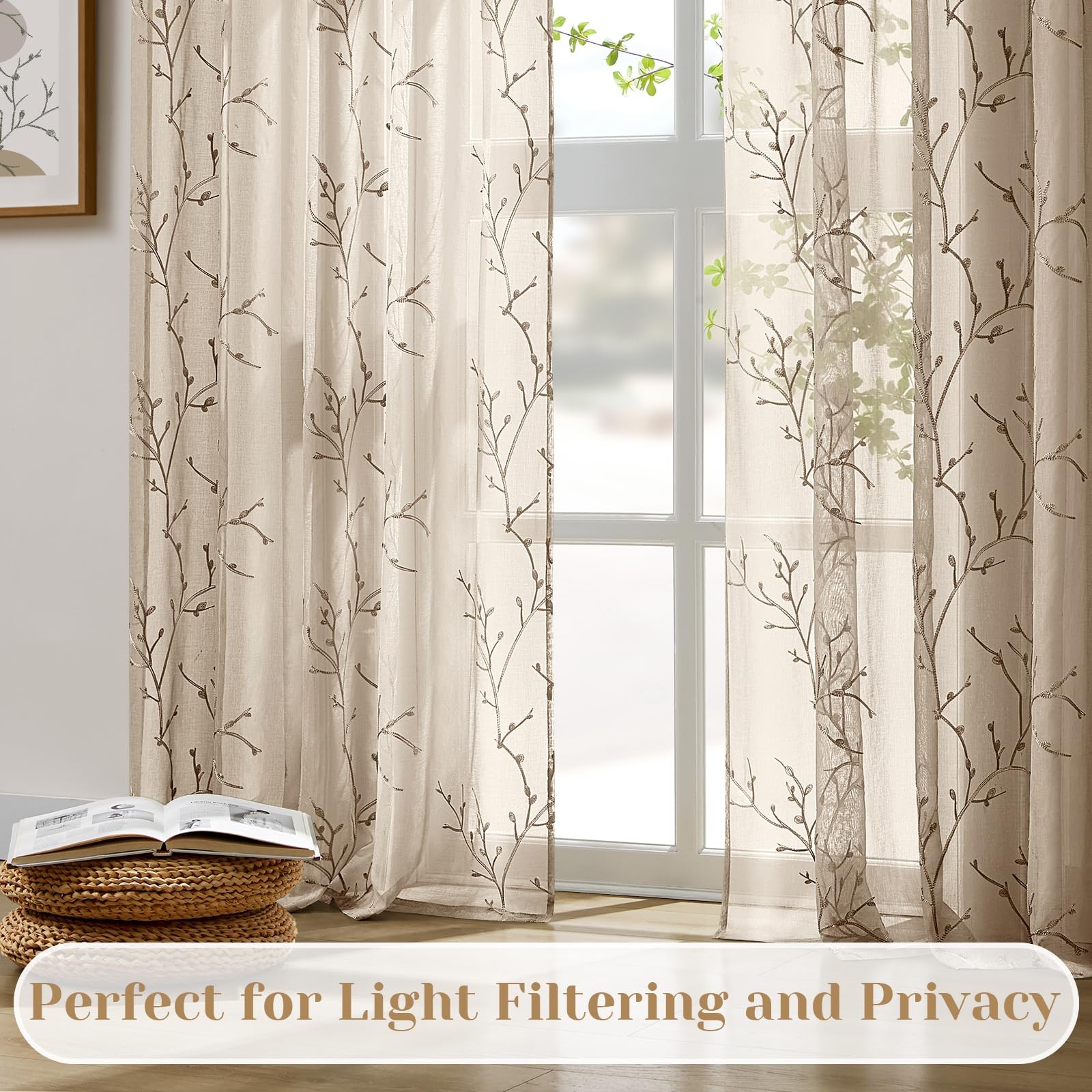 ' s blackout curtains are the perfect combination of traditional craftsmanship and the latest modern technology. Committed to designing and manufacturing to improve the sleeping environment and quality for people. With the idea of providing a better shading effect and cost-effective product for our customers, our ready-made curtains are offered in an array of standard sizes sure to accompany the window and setting for any setting. Regardless of your application, you are sure to find ready-to-hang curtains for your home from us! We have cooperated with over 10 factories to manufacture environment-friendly home products, also we improved our craft by using the new stitching sewing, and coloring craft program in production to ensure that every purchase will receive a professionally constructed curtain set that is sure to hang. ★AMAZING SHEER CURTAINS: This embroidered semi sheer curtain is made of 100% high-quality polyester fiber, the fabric is a very soft and good touch, but still retains its toughness to prevent tearing easily. The faux linen texture allows beautiful light while providing privacy, creating a bright and airy effect to the room. ★EXQUISITE WORKMANSHIP: All edges are carefully stitched without uneven hems, we pay attention to every detail of the curtains, and the 3'' rod pocket makes the panels drape perfectly and beautifully over your windows. ★ELEGANT DESIGN: A pretty embroidered branch pattern design on the sheer curtain creates a unique, natural, and elegant sense to your room, bringing unique aesthetics and making it the best home decor item! ★WIDE USAGE: These sheer voile window treatments are available in different colors and sizes, suitable for Living Room, Bedroom, Dining Room, Kids Room, Guest Room, Hotel, Patio Door, Balcony, and Sliding glass door. ★EASY CARE: Machine wash warm with similar colors. Machine wash gently. Do not bleach. Tumble dry low. Warm iron if needed. Do not dry clean.