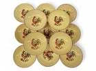 The Taylor Smith Taylor Vintage Ironstone Cannes Atomic Onion Dinner Coffee Set is a charming and unique dining set featuring a rooster pattern in a vibrant yellow color. This round-shaped set includes 8 place settings, with a variety of pieces such as bowl sets, dessert plates, salad plates, bowls, dinner plates, and mugs. Made from ceramic with a smooth finish, this set exudes a retro charm that is perfect for adding a touch of vintage flair to your dining experience.