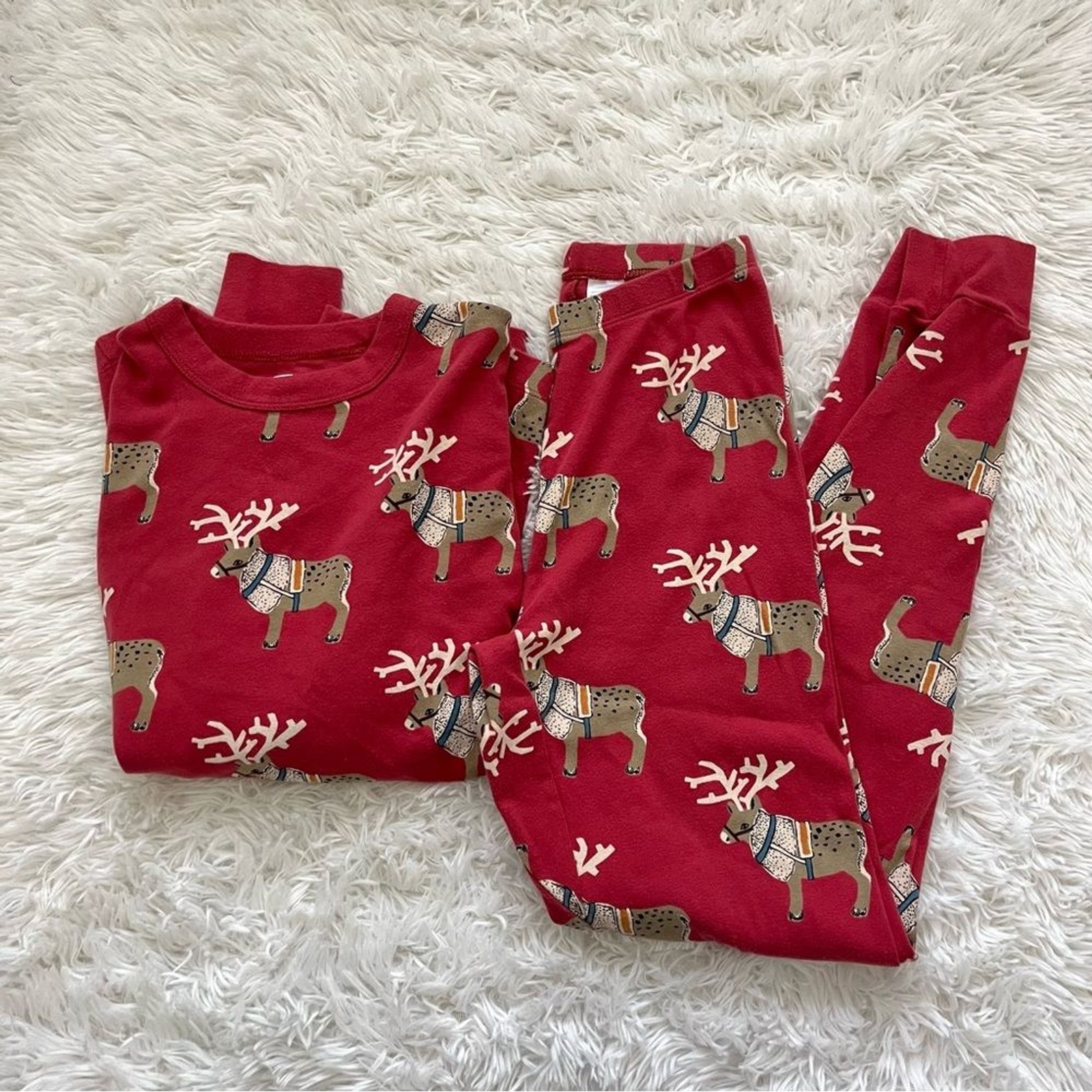 Get into the holiday spirit with this festive Tea Collection pajama set. The set includes a cozy pair of long pants and a matching top, both adorned with playful reindeer designs. The vibrant red color adds a pop of holiday cheer to your sleepwear collection. Crafted from high-quality materials, this pajama set is designed for comfort and durability. The set is available in a women's small size and is perfect for regular wear. Add some holiday cheer to your sleepwear routine with this Tea Collection pajama set. Tea collection reindeer Christmas pajamas set long pants women’s small Matching set includes: Crew neck long sleeve top Jogger style pants Gently pre loved, excellent condition All items ship the next business day! I love offers & give generous discounts on bundles