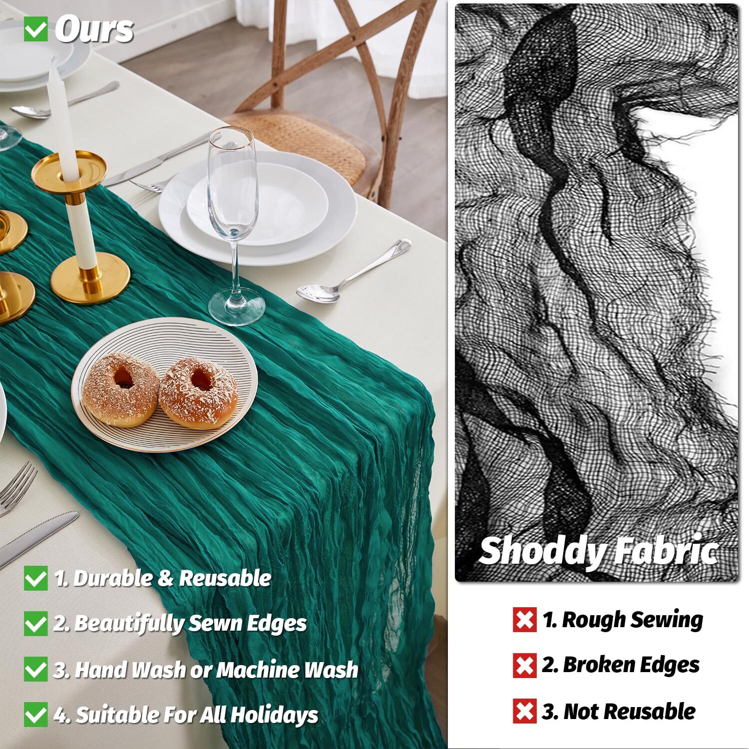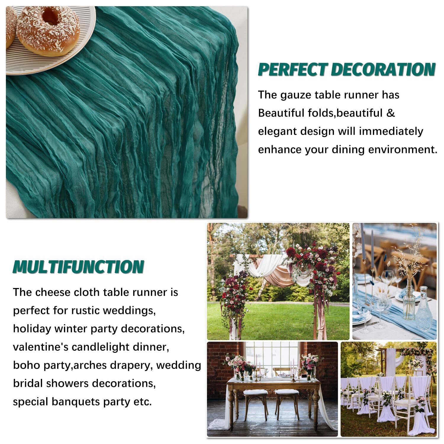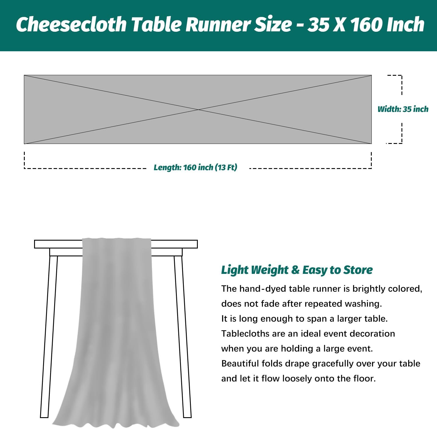 Teal Cheesecloth Table Runner,35 x 160 Inch Gauze Table Runners for Wedding Bridal Shower Birthday Party,Farmhouse Holiday Table Runner for Indoor & Outdoor Description and features PERFECT DECORATION - Our boho table runner made of 100% High quality gauze,the fabric is very soft,exquisite sewing and not easy to loose thread. The gauze table runner has Beautiful folds,rustic and beautiful,drapes gracefully across your table and let it flow loosely on the floor. Give your guests a great dining experience! SUITABLE SIZE - The cheesecloth table runner size is 35 x 160 Inch,light weight and easy to store. It is long enough to span a larger table. Tablecloths are an ideal event decoration when you are holding a large event. Use the table runners as a colorful centerpiece with some candles and flowers, the beautiful & elegant design will immediately enhance your dining environment. EASY CARE - The hand-dyed table runner is brightly colored, does not fade after repeated washing, and can be reused. Hand wash gently or machine wash in cold water, tumble dry low. Do not use bleach or detergents containing bleach, preferably hang for drying away from direct sunlight. MULTIFUNCTION - Holiday Table Runner can be used as centerpieces for tables, or as chair sashes,wedding arch,background cloth and more! Unusual decorating ideas to impress your guests. The cheese cloth table runner is perfect for rustic weddings,holiday winter party decorations,valentine's candlelight dinner,boho party,arches drapery,wedding bridal showers decorations,birthdays,special banquets party etc. EXCELLENT CUSTOMER SERVICE - Boho table runner for housewarming gift! Your satisfaction is our motivation. Please contact us If there is a problem with the product received, We will definitely give you a perfect solution. Return Policy ⦿ All our products come with a 30-Day Return Policy. If you would like to return your item and you are within 30 days of the purchase, and it is still in its original condition, you can return the item by contacting us through eBay messaging. ⦿ If you are not 100% satisfied, please let us know the Detailed Problem,We will give you a 100% satisfactory solution ⦿ If you received an incorrect, damaged, defective, or item not as described, contact us for a partial/full refund or replacement on our cost. ⦿ Free Shipping and Free Return 30-Days Money Back Guarantee. ☎ For all returned products, buyers MUST contact us for the returning address. Shipping ⦿ We do not ship to a different address. we will ship to the address you provide on the ebay only. Please check your address before purchase. ⦿ It should take 2-4 business days for the product to reach your destination. ⦿ If the product doesn't reach your destination within the time limit, please give it an additional 1-2 business days in case of postal delays and/or possible technical issues. ⦿ We use a selection of shipping services such as UPS, FedEx, USPS etc. ⦿ We ship only to the 48 contiguous states of America. We do not ship to Hawaii, Alaska, US Protectorates, APO/FPO addresses. Local pickups are not offered. ☎ If it takes any longer than that, please do not hesitate to contact us to resolve the issues. Contact us ☎ Please contact us via eBay message. And your message will be replied within 1 business days. For any queries, please feel free to contact us, we will get back to you as quickly as possible. Customer 100% satisfaction is our first priority and goal. We are always working hard for maintain high standards of excellence and resolve your problem in best way. So your POSITIVE FEEDBACK is very important. If you have any problem of the item, please feel free to let us know before leaving your feedback. We will try our best to solve your problem. About us We are here to give you quality products, competitive pricing and amazing service in order to make sure you get the best deal online, Thank you for your business and the opportunity to serve you.