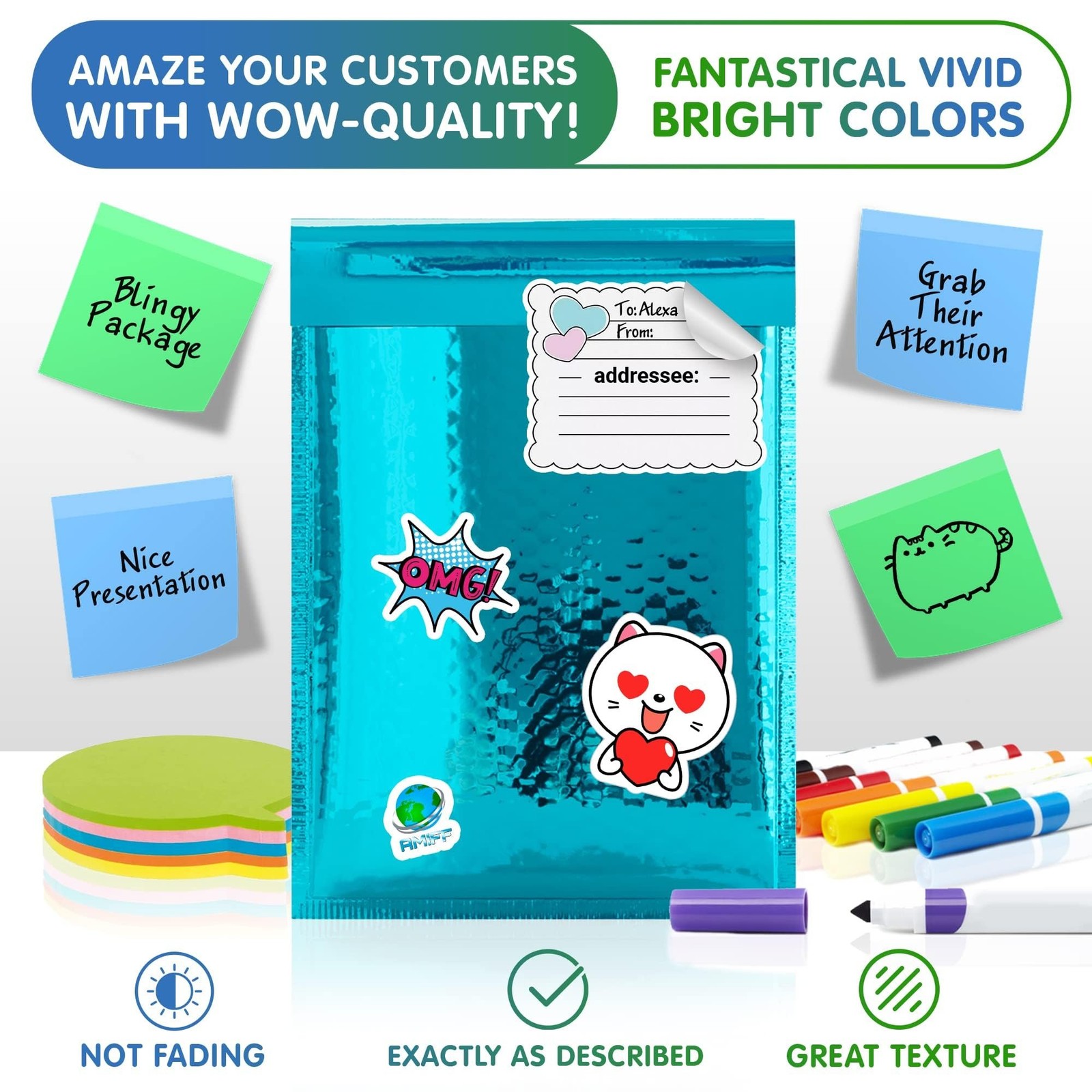 Teal Metallic Bubble Mailers 5x9", 300 Pack Waterproof Padded Shipping Envelopes Shop AMZ Supply About Us Contact Us Add to Favorite Business Supplies Direct Teal Metallic Bubble Mailers 5x9", 300 Pack Waterproof Padded Shipping Envelopes SKU: AMIFF-M-300GMBMT-5x9TL Pack of 300 Shiny Shipping Bags, 5 x 9 Inches. Teal metallic envelope combine style with function. They will add a professional touch and ensure your items arrive safely and in great condition. Robust Material for Lasting Use. Made with a laminated, thick material, foil mailer is built to last. The strong, leak-proof design of foil bubble mailer keeps contents secure and dry, making them a reliable choice for all your mailing needs. Efficient and Durable Construction. Enjoy the balance of strength and flexibility. Shiny bubble envelopes have sturdy side seams and are easy to label, perfect for regular mailing. Poly mailers metallic are user-friendly and maintain their quality over time. Enhanced Protective Features. Not just attractive, sparkle bubble mailers offer excellent padding and are waterproof and tear-resistant. Metallic bubble envelope mailer protects your items, ensuring they reach their destination just as you sent them. Ideal for Various Shipping Needs. Perfect for sending small items like cosmetics, jewelry, or tech gadgets. Opaque, air-tight mailing envelopes bubble metallic are suitable for small businesses and personal use, meeting a wide range of shipping requirements. Customer Service & Returns Customer Service hours are Monday-Friday from 8:00am-6:30pm EST. We offer a 30-day return policy for most products if the item(s) are unused, unopened, in original condition, with all original packaging, components, instructions, and warranty materials. Items must not be defaced (e.g. no handwriting or other marks on packaging). We will arrange & pay for return shipping on any item that we shipped incorrectly. Return shipping fees incurred by purchaser will not be reimbursed. Returns must use shipping label(s) we provide. Please submit a return request for a return authorization number (RA). The RA number will prevent any further delay with the return process. Please remember to keep all the original packaging and documentation in the event your item(s) needs to be returned or exchanged. If your return is not eligible for return under this policy or otherwise does not comply with this policy, you will be notified and no credit or refund will be issued and your products will not be returned to you. Disclaimer: Due to Manufacturer Product Updates: Product packaging and images may vary. Returns are not accepted for variances in packaging. Handling & Shipping: Most items are shipped within 3-5 business days of receiving cleared payment. We may ship each product separately from different warehouses for expedited delivery as we utilize alternative warehouses across the Continental United States Two business day handling. This excludes weekends and shipping holidays. Orders placed on a weekend or shipping holiday will ship the next business day. Product Description Disclaimer: If it is a variation listing, then the listed details of the product specifications in the description (e.g. size, color, packaging, etc.) specified for one of the variations.