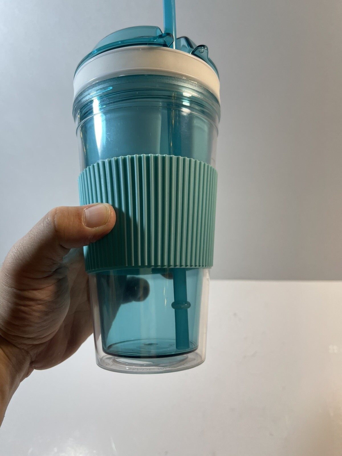 The product is a transparent cup in teal, light blue, and green colors. It comes with a soft grip lid and a straw. It is part of a set that includes a cup.