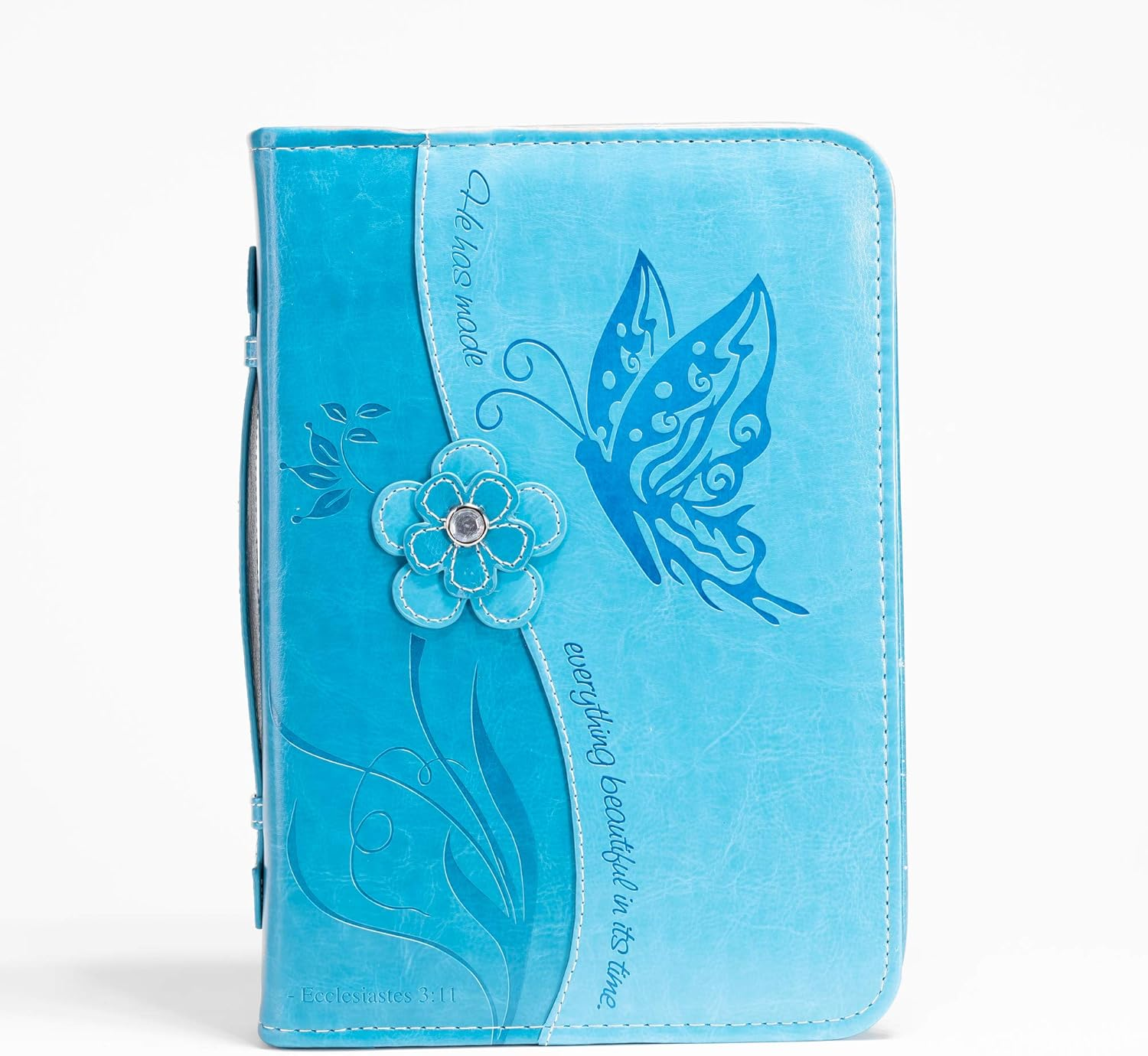 This teal blue butterfly Bible cover is both beautiful and practical! The PU material feels durable, and the zipper closure keeps my Bible secure. I love the elegant jewel accents and layered design—it adds a touch of elegance while staying lightweight. The handles make it easy to carry, and the pen loop is a handy bonus. Perfect for protecting my Bible while adding a little joy to my daily devotion time. Highly recommend for anyone looking for a stylish yet functional cover!
