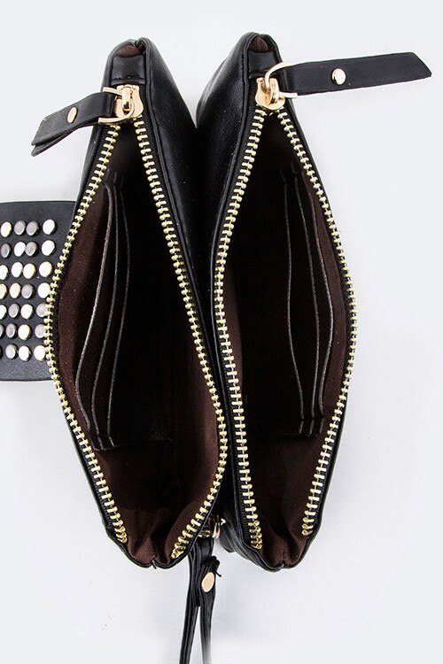 Length 8.25 in Height 4 in Double Compartments Gold & Silver Flat Studs Zipper Closure Purse is Teal Color