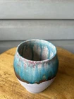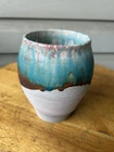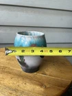 Teal Brown River Drip White Abstract Raku Studio Art Pottery Vase 5” Signed. Approx. 5” tall, 4” wide, and a mouth opening of 3.25.” Incised by artist on base. No chips or cracks. Minor scuffs/marks as common in matte finish pottery. Please see all photos as part of item description.