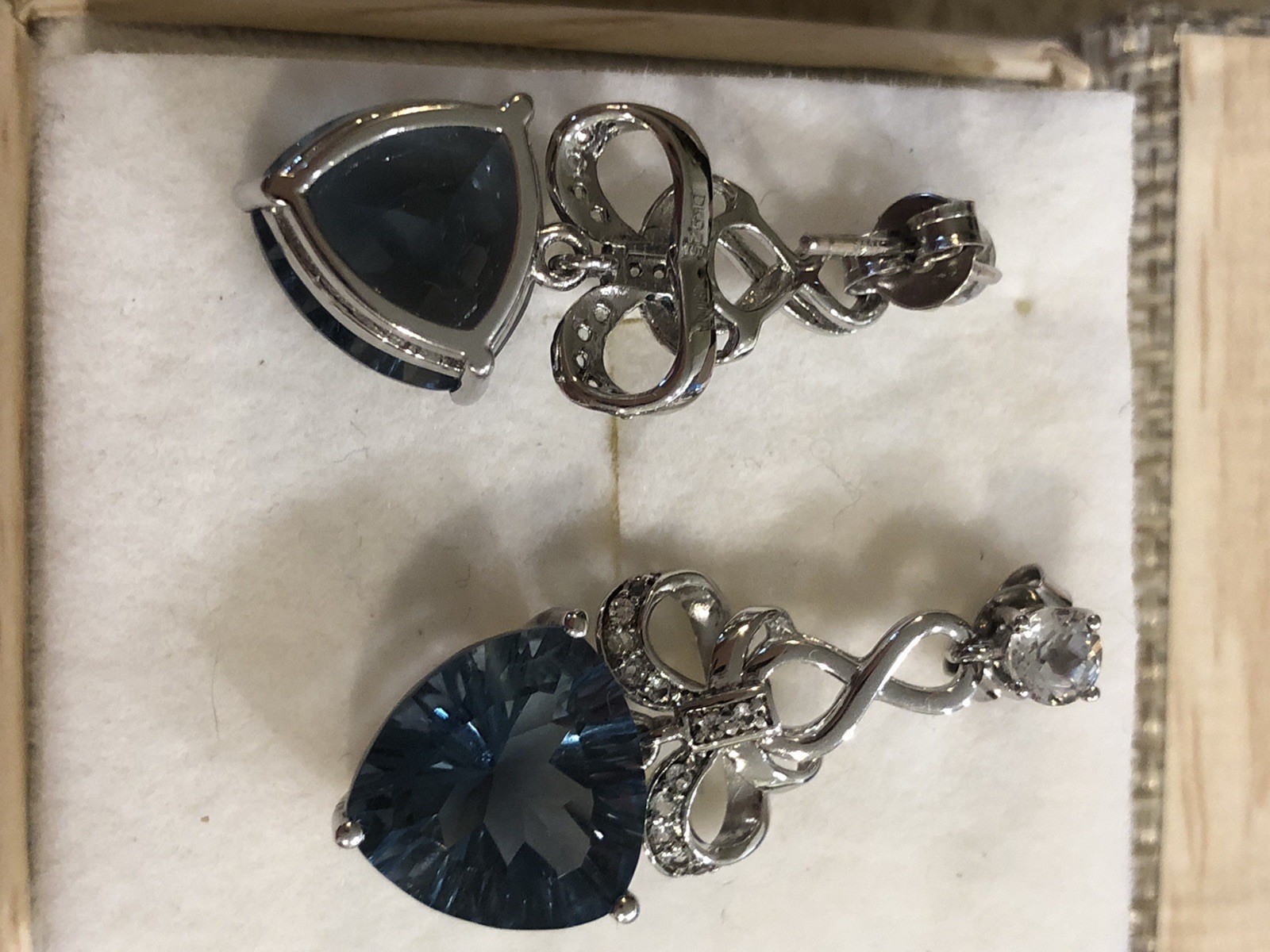 The product is a pair of Teal Fluorite Trillion Quantum Cut Silver Earrings with White Topaz Round accents. These dangle/drop earrings are handmade and feature a natural teal fluorite main stone in a trillion shape, with a total carat weight of 11.90 CTW. The earrings are set in 925 silver with a prong setting and have an excellent cut grade. They are ideal for weddings and other occasions . The earrings are from the brand Jtv and are crafted in China. Teal Fluorite is considered Rare making it a prized find for Collectors.