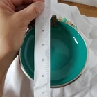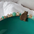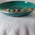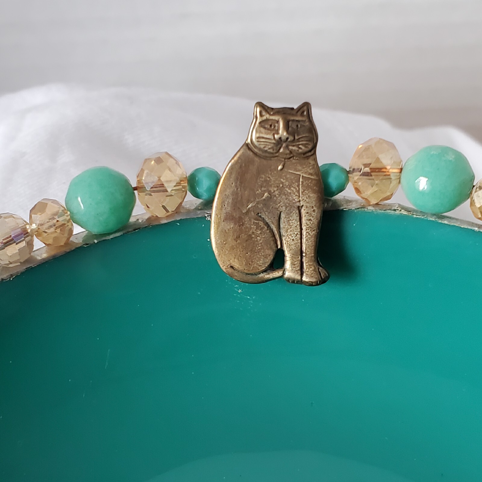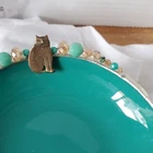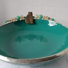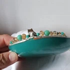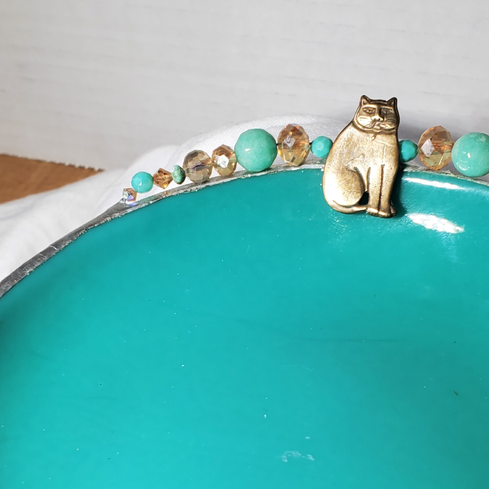 Teal Glass Trinket Dish Bowl Cat Charm Beaded Metal Trim.