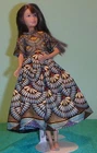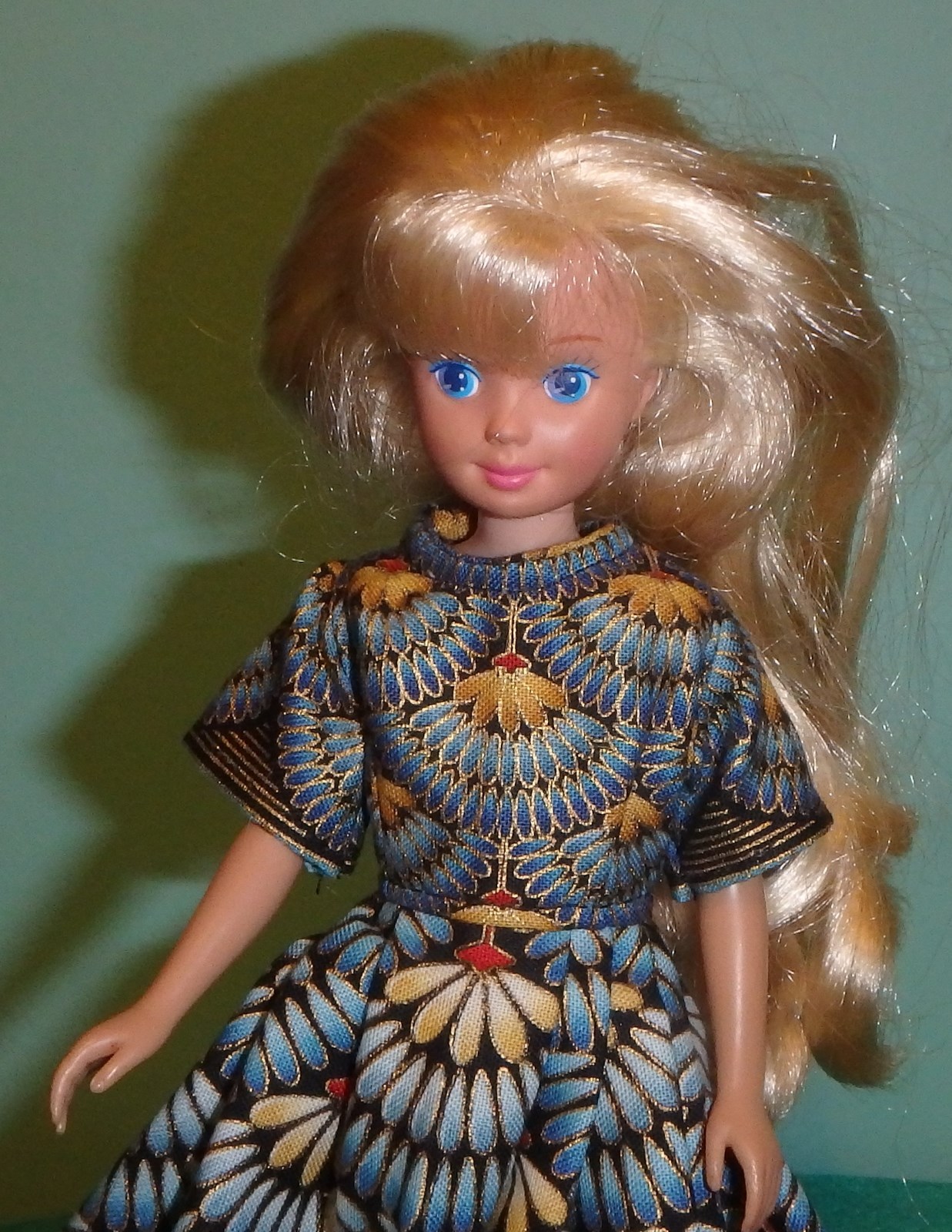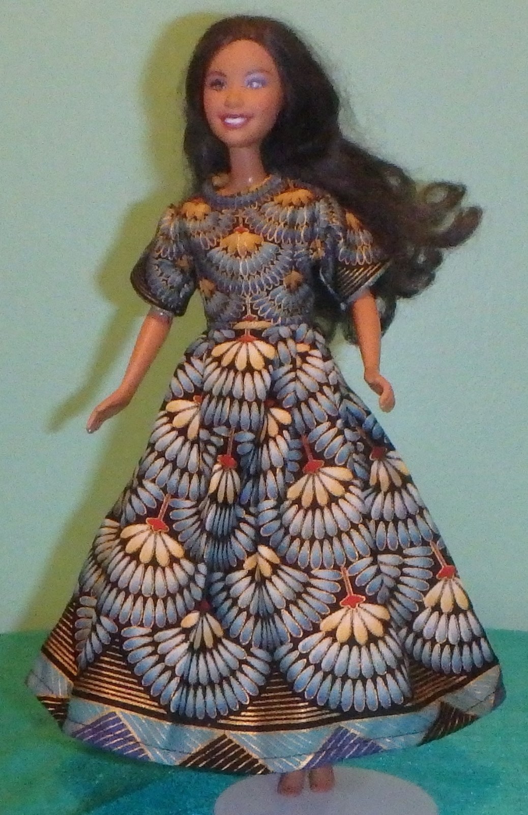 This dress is for Barbie's little sister Skipper. The fabric is teal, gold and black in a fan-shaped print. The bodice has a scooped neckline and short sleeves. The skirt falls to just above or below the ankles depending on the doll wearing it. Snap closure in the back . This dress would also fits the Original Skipper (as shown) New Skipper (as shown with blue stripe in her hair), HS Musical Gabriella (as shown) and should fit other dolls of the same body type. It does not fit Teen Skipper because she is too tall and the bodice would be too tight. If you have more than one of the Barbie and sister dolls you might want to look at the other categories for matching dresses as seen in the group photo. All my designs are one-of-a-kind. Each has a small label sewn in the back seam and marked with my inventory code. Each design is photographed and carefully described in my personal design catalog so I can be sure never to repeat anything I make. Handsewn detailing increases the cost/value of the design. I make the clothes strong with sealed seams to give lasting life even when in the hands of a child. Note: Doll is a model and not for sale.