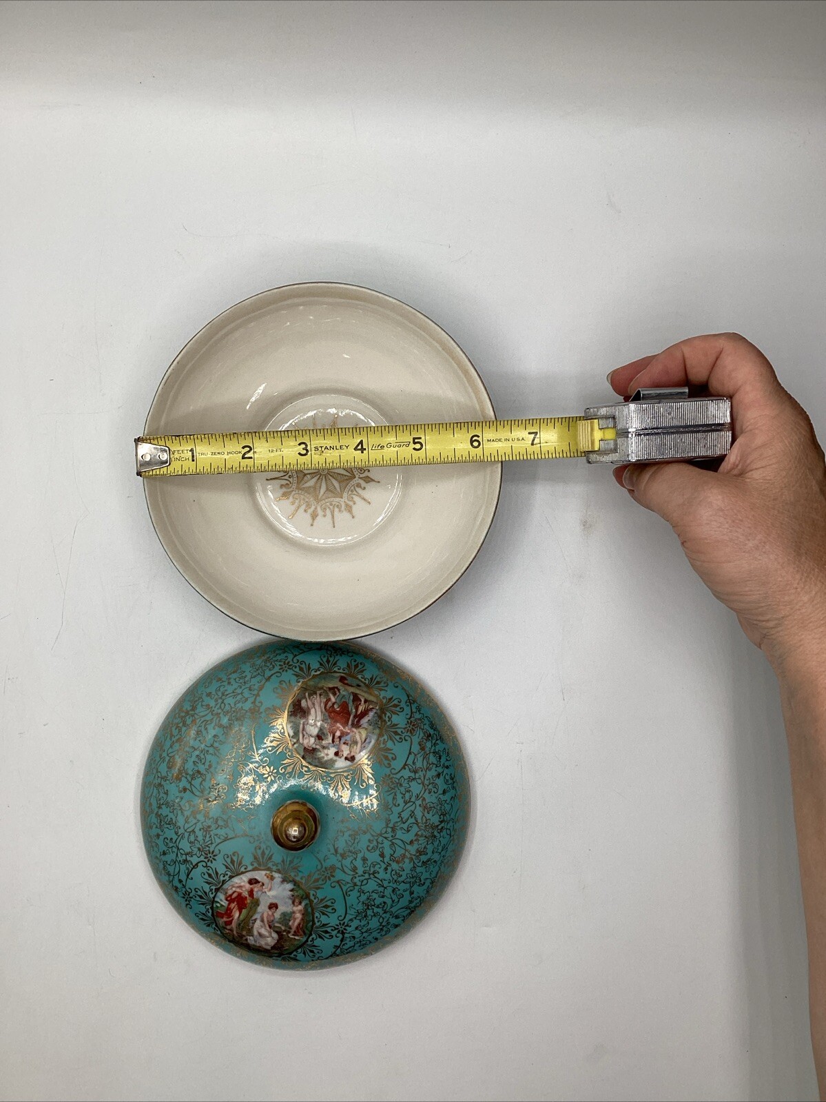 This exquisite candy trinket dish is a true gem for collectors. Hand-painted in Teal and Gold, it features a beautiful design that is sure to catch the eye. The dish comes with a lid and is made of high-quality porcelain, ensuring that it will last for years to come. With its unique design and intricate details, this candy trinket dish is a must-have for anyone who loves collecting decorative items. It is perfect for storing small items, such as candy or jewelry, and will add a touch of elegance to any room. Don't miss out on this stunning piece, crafted by M & R USA.