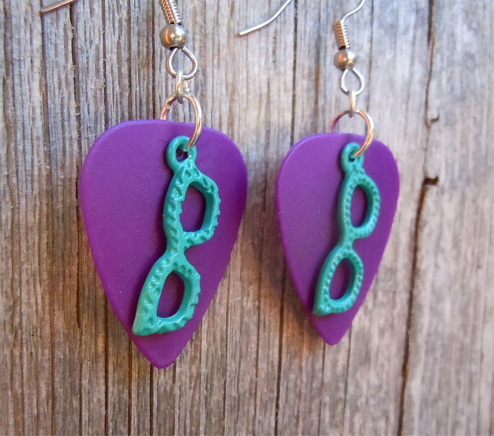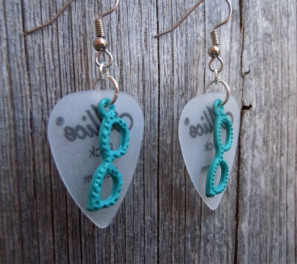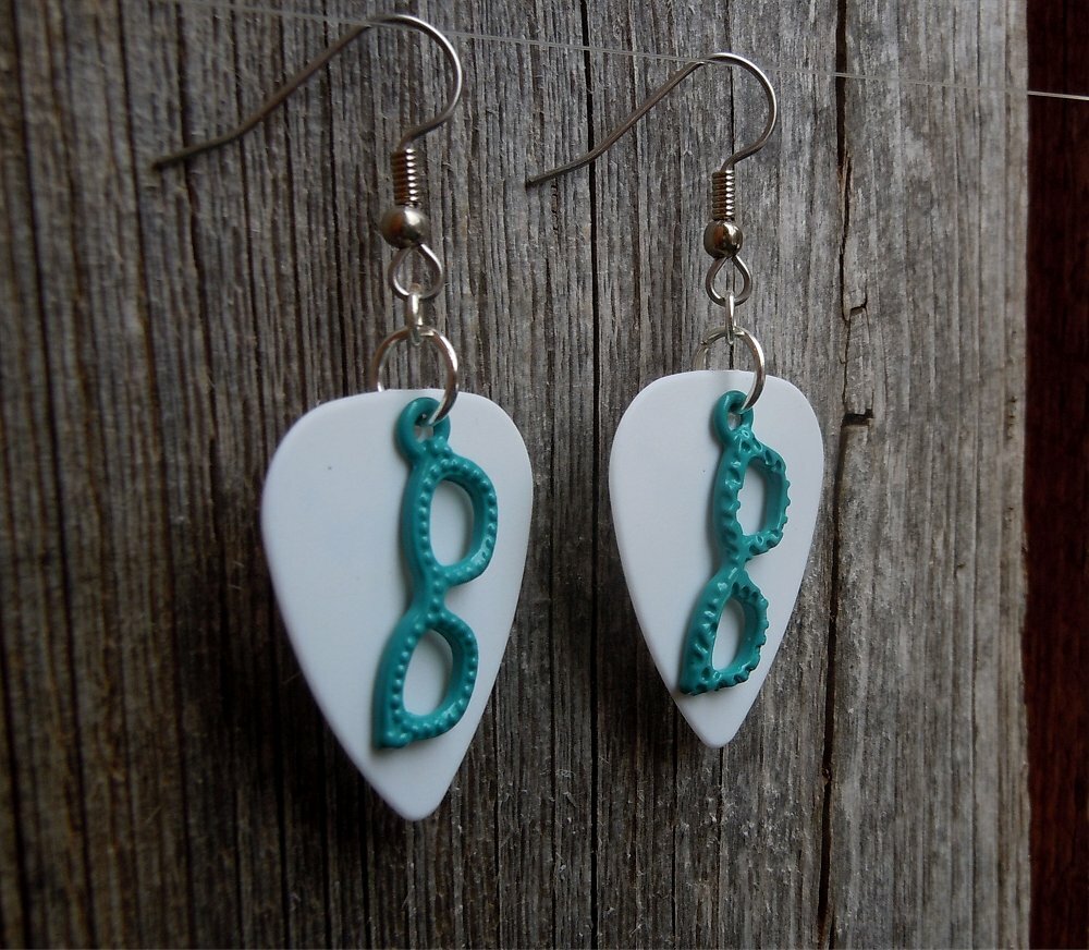 These are made with real guitar picks. That means that the back of the guitar picks may have the emblem of the guitar pick company printed on it. I also used teal metal glasses charms. PLEASE NOTE: These are available in many guitar pick colors and patterns. They are all listed in the drop down menu. They are 2.25 inches long from the top of of the ear wire curve to the very bottom of the whole earring, and they have surgical steel earwires (nickel free, hypoallergenic). To get an idea of how long the earrings will be on you, start from where your ear is pierced and measure down. All of my jewelry and accessories are handmade by me. Made in and shipped from Lubbock, TX. USA Flat Rate Shipping. You pay for shipping on the first item, all additional items have no additional shipping fees.