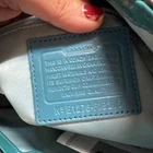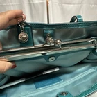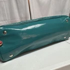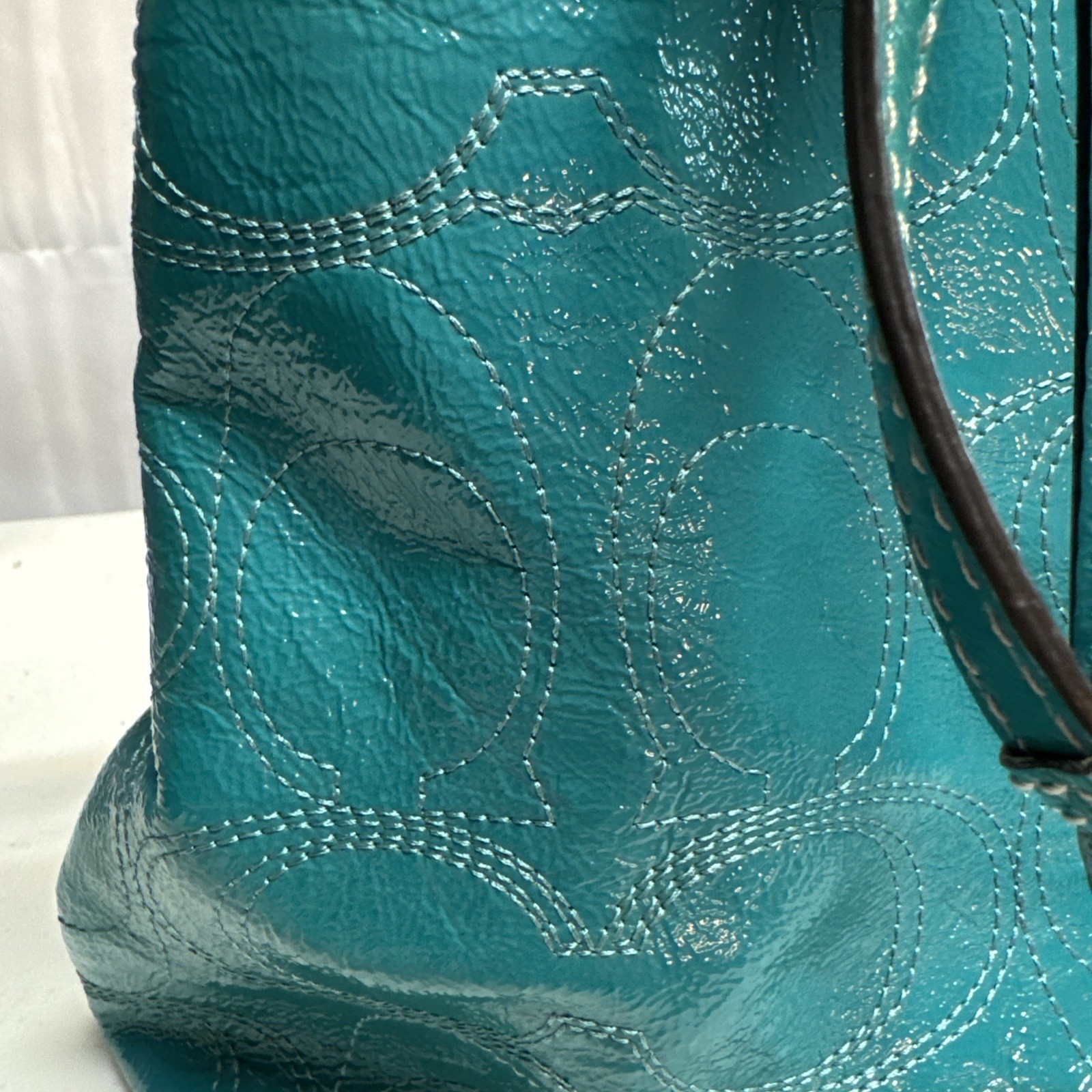 EUC The Teal Patent Leather Satchel Carry-All Stitch Monogram Bag 2011 from Coach is a stylish and practical medium-sized handbag. Crafted from patent leather with signature stitching, this satchel features a kiss lock and snap closure, double teal handles, and silver hardware accents. The interior is lined with teal polyester and offers plenty of space with dimensions of 16 inches in length, 7 inches in width, and 10 inches in height. With its unique design and high-quality craftsmanship, this Coach Carry-All bag is a fashionable and functional choice for everyday use.
