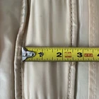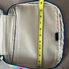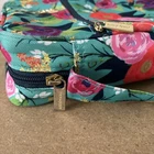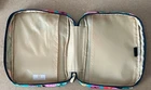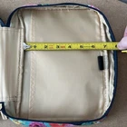 Teal Pink Floral Soft Cover 9 x 7 x 2.25” Zipper Pocket Fit my thicker study bible with no problem. By Mary Square. Gold metal emblem on front is slightly crooked (came that way). Has an elastic pen holder inside. No rips or tears. No fading. Minor wear on the zipper pulls. See pictures.