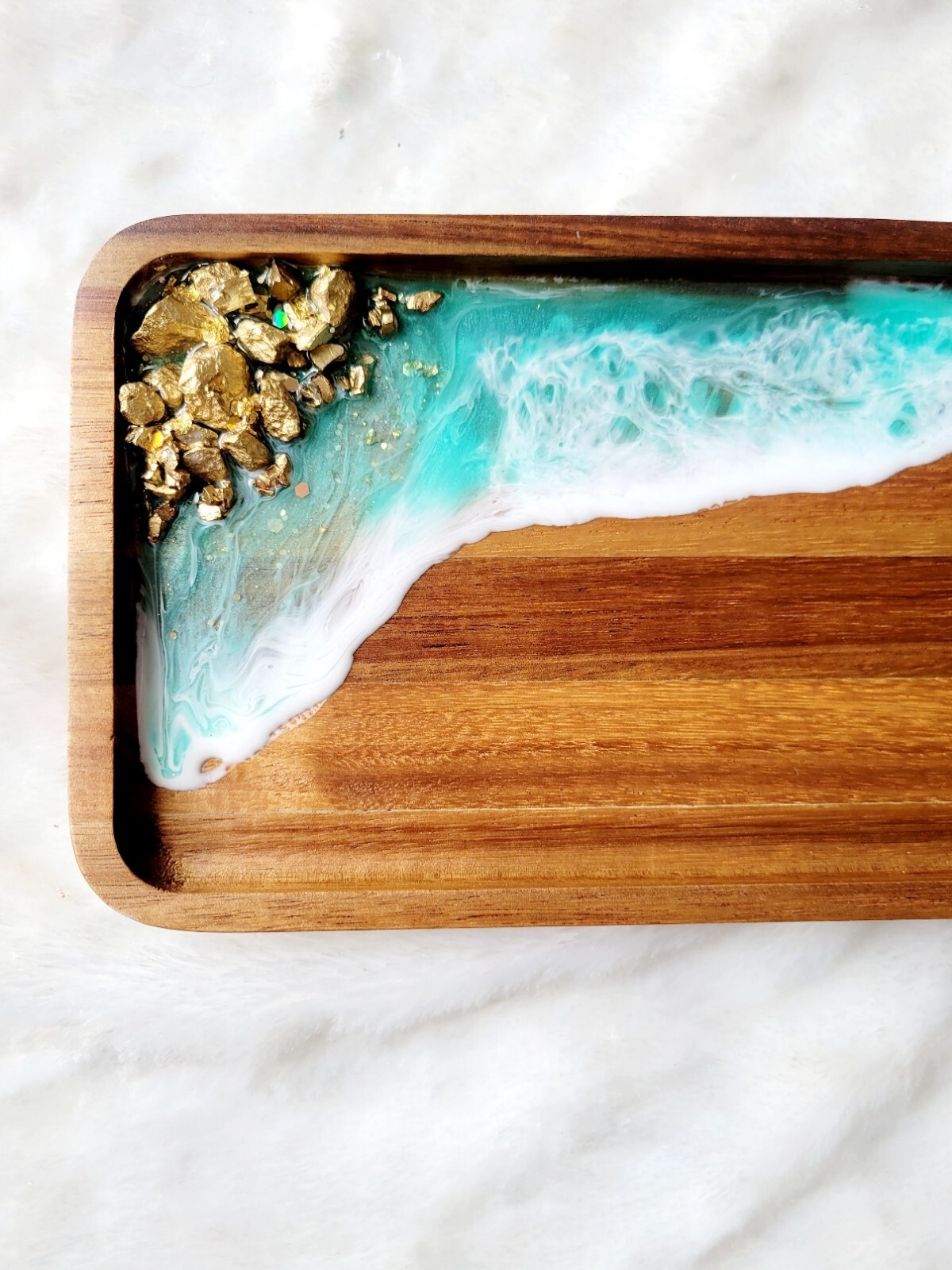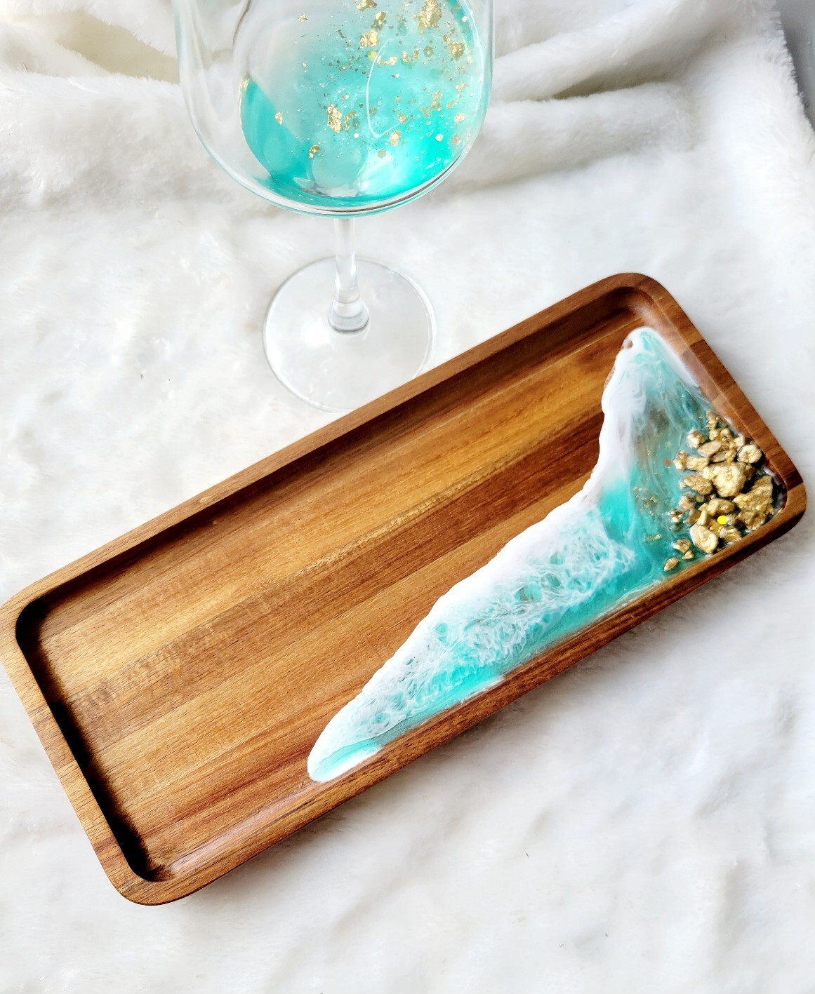 This stylish teal resin accent tray is a must-have for organizing jewelry, perfumes, or small decor pieces! Its vibrant color adds a pop of elegance to any space, and the durable food-safe material makes it versatile. Love how it keeps my vanity clutter-free while looking chic. Perfect size for small essentials, and the handmade touch makes it feel special. Highly recommend!