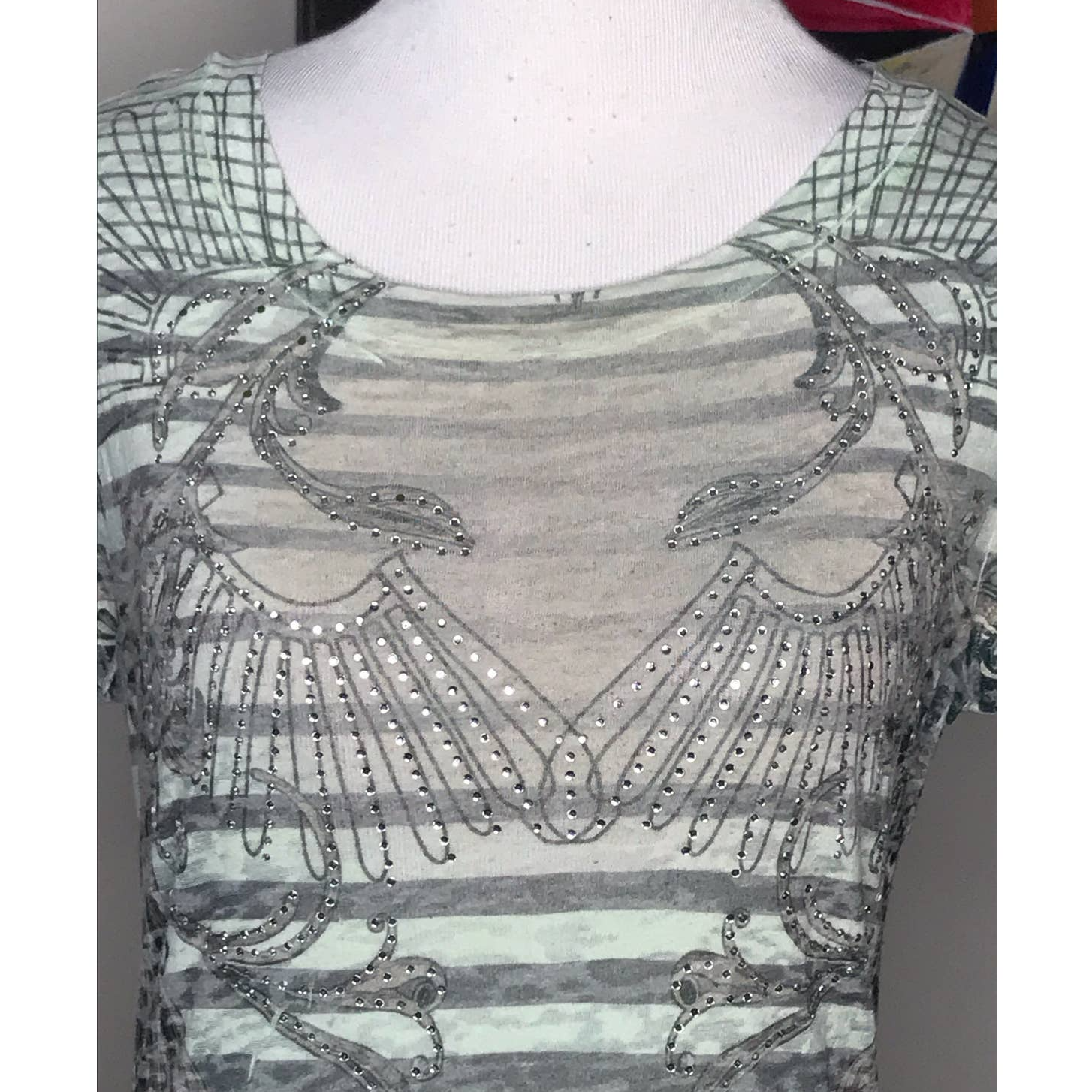 Fit:Extra-SlimAccents:StuddedDepartment:WomenUPC:Does Not ApplyColor:GreenSeller Notes:“Clean and good preowned.”Sleeve Length:Short SleeveType:T-ShirtNeckline:Scoop NeckSize Type:RegularStyle:BasicOccasion:CasualMaterial:---gtin13:Does Not ApplyVintage:NoBrand:Buy Mel & WendSize:SPattern:Striped