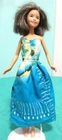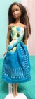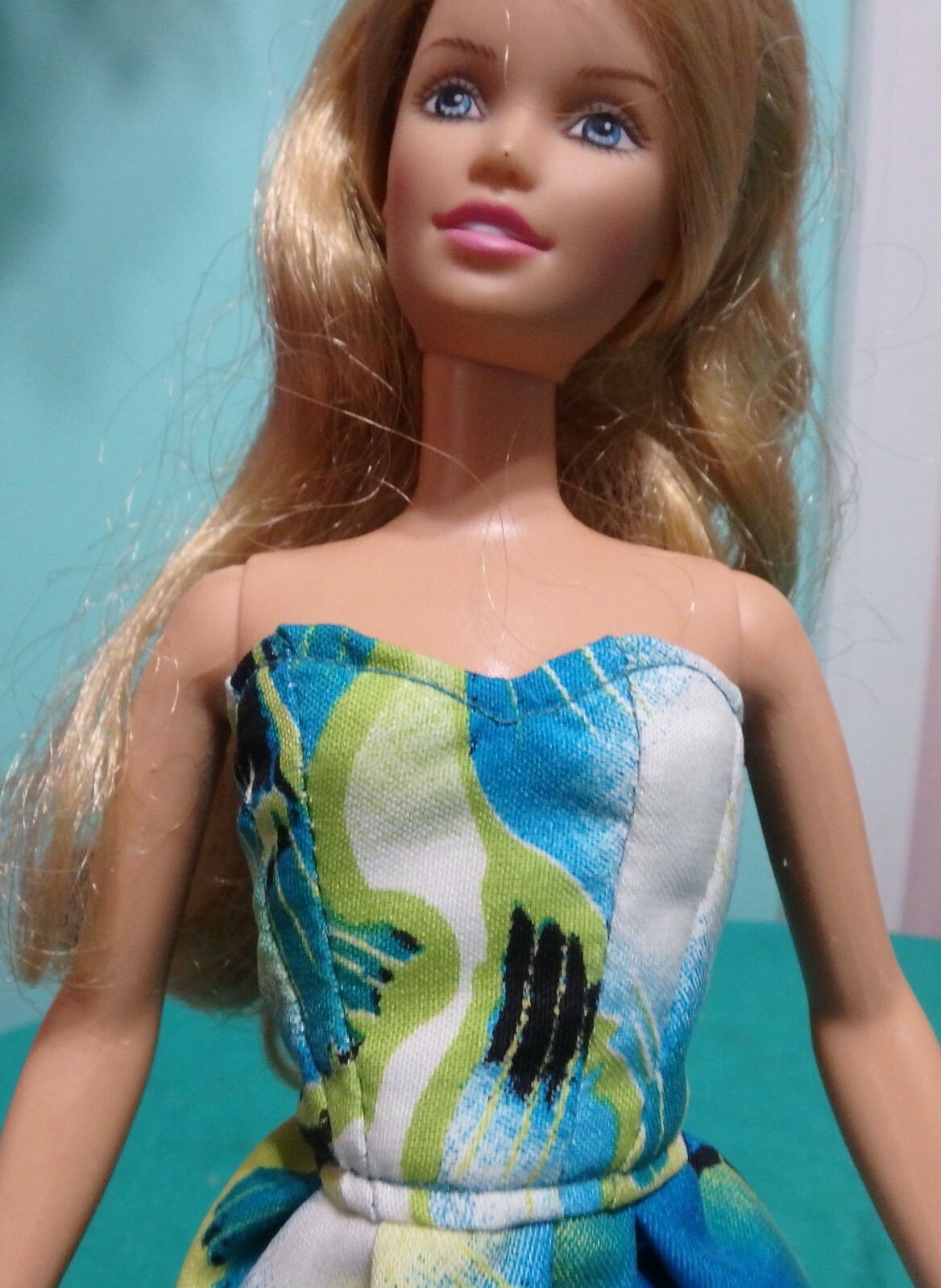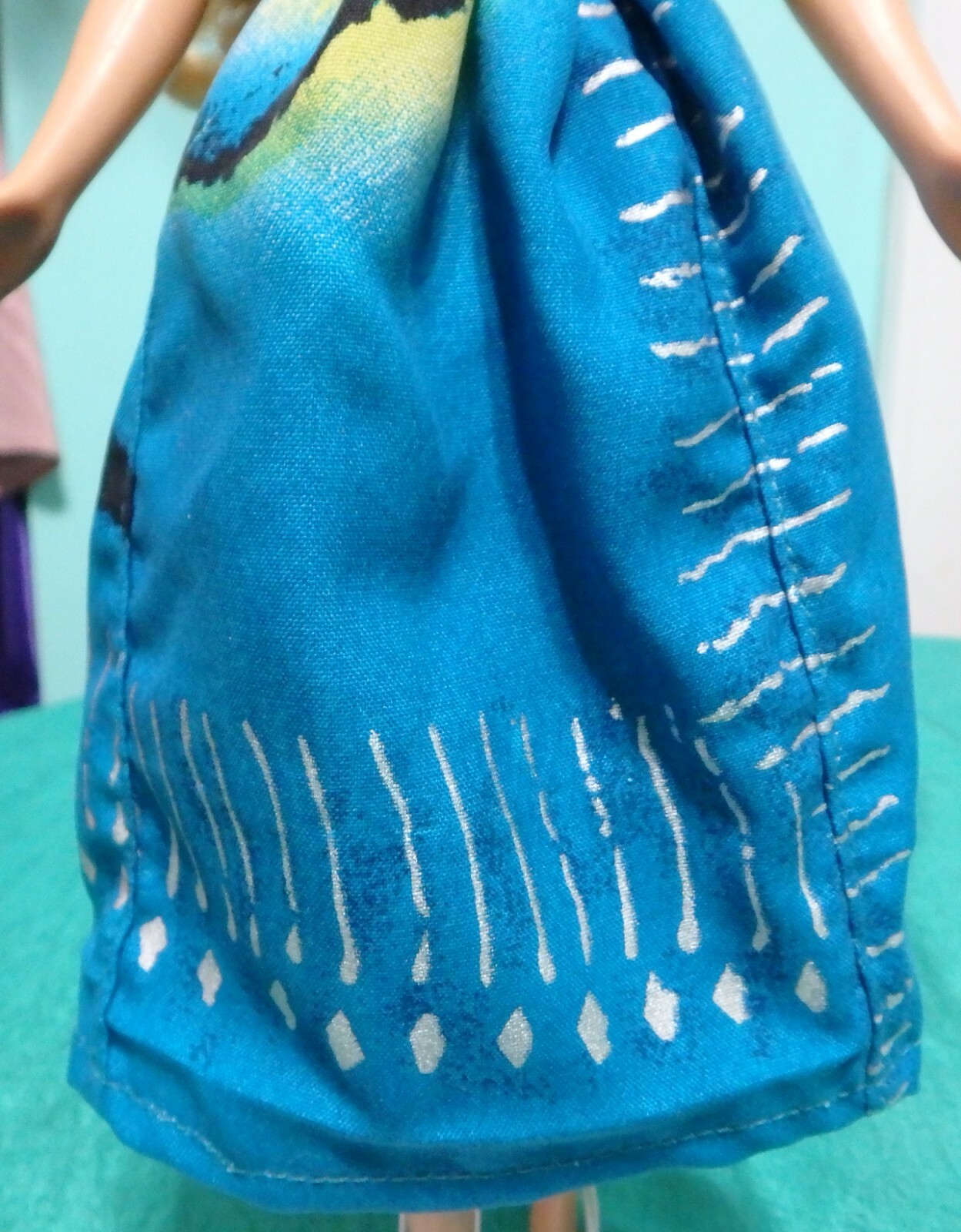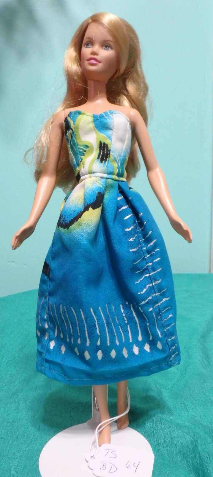 This pretty summer dress is for Teen Skipper, one of Barbie's sisters. The strapless, sweetheart bodice and tea-length narrow skirt are of a lovely shade of teal with splashes of white, yellow and black. A line of white stripes runs down one side and around most of the bottom. The dress closes in back with a snap. This set was designed to fit Teen Skipper (as shown), new Skipper with blue in her hair and HS Musical dolls (as shown on Gabrielle). It will also fit Original Skipper but not Stacie or New Stacie because it will be too long on them. This one will also the flat chested Barbies (as shown). Most of my designs are one-of-a-kind. Each has a small label sewn in the back seam and marked with my inventory code. Each design is photographed and carefully described in my personal design catalog so I can be sure never to repeat anything unique I make. Hand-sewn detailing increases the cost/value of the design. I try to make the clothes enough to have lasting life even when in the hands of a child. Note: Doll is a model and not for sale.