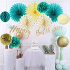 Teal Gold Birthday Decorations: The package includes 2pcs 14" teal paper fans, 1pc 14" cream yellow cutout paper fan, 2pcs 12" gold polka dot paper fans, 4pcs 10" tissue pom poms (2*teal+gold+cream), 1pc 8" teal honeycomb ball, 1pc 8" gold paper lantern, 1pc gold happy birthday banner. You'll have everything for your birthday party. Easy to Assemble: all paper fans and tissue pom poms are pre-folded, which are easy to assemble in minutes. Then hang the paper fans and other party supplies on the ceiling or walls, mount them on the window, and on top of table centerpieces. Bring every guest a surprise! Unique color: elegant gold polka dot cream colors, popular teal. With a beautiful, teal & gold color palette. This birthday party color idea is perfect for teal gold party/baby shower decorations or women's parties. Widely Applications: teal and gold baby birthday party, women's 30th/40th/50th/60th birthday, mermaid birthday decorations, baby shower, turquoise and gold birthday decorations, bachelorette party decorations, and more. Services: this teal gold birthday party decoration set is designed with beautiful decoration items to create unique birthday decorations. If you have any questions, you can send an E-to us, and we will reply within 24 hours.