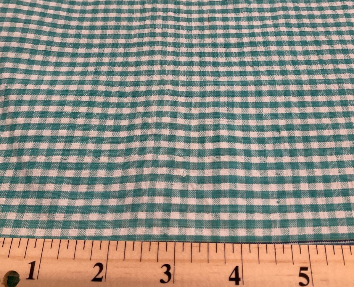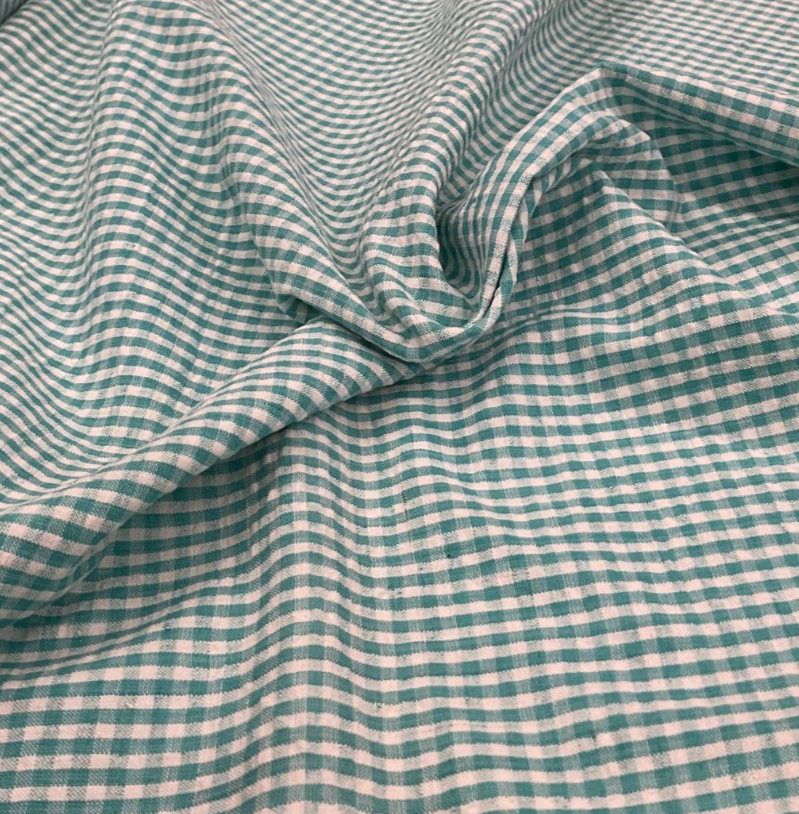 TEAL - WHITE COTTON GINGHAM SEERSUCKER PURCHASES OF MORE THAN ONE YARD WILL BE CUT IN ONE CONTINUOUS PIECE. COTTON FABRIC THAT IS APPROX. 44-45 INCHES WIDE SMOKE FREE ENVIRONMENT