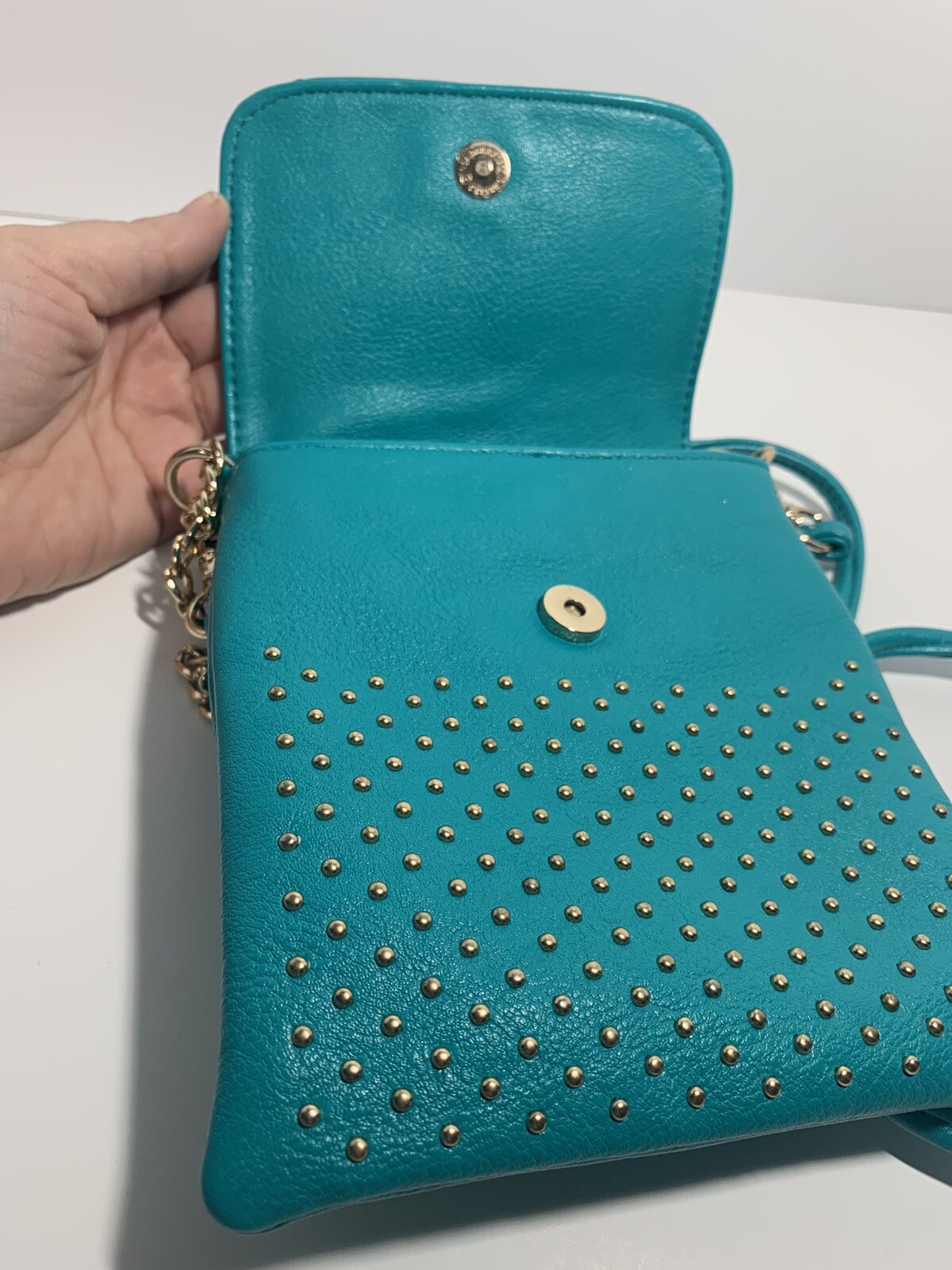 Teal Gold Studded Accent Purse Cross Body or Over The Shoulder. Lovely purse comes with short gold chain for over the shoulder wear or a long teal removable strap for cross body wear. Items are carefully inspected and sealed after photos. Please note, item measurements are approximate and in the photos. We cannot check additional measurements or details for you. Colors remain vivid, we store our items in a smoke free environment If the item is pre-owned, it's cleaned per eBay standards. We do not use any freshener or scents. Shipping and Return Details We ship daily so that you receive your item quickly. I have a 30 day return policy. Please feel free to ask any questions you may have. I try to answer as quickly as possible.