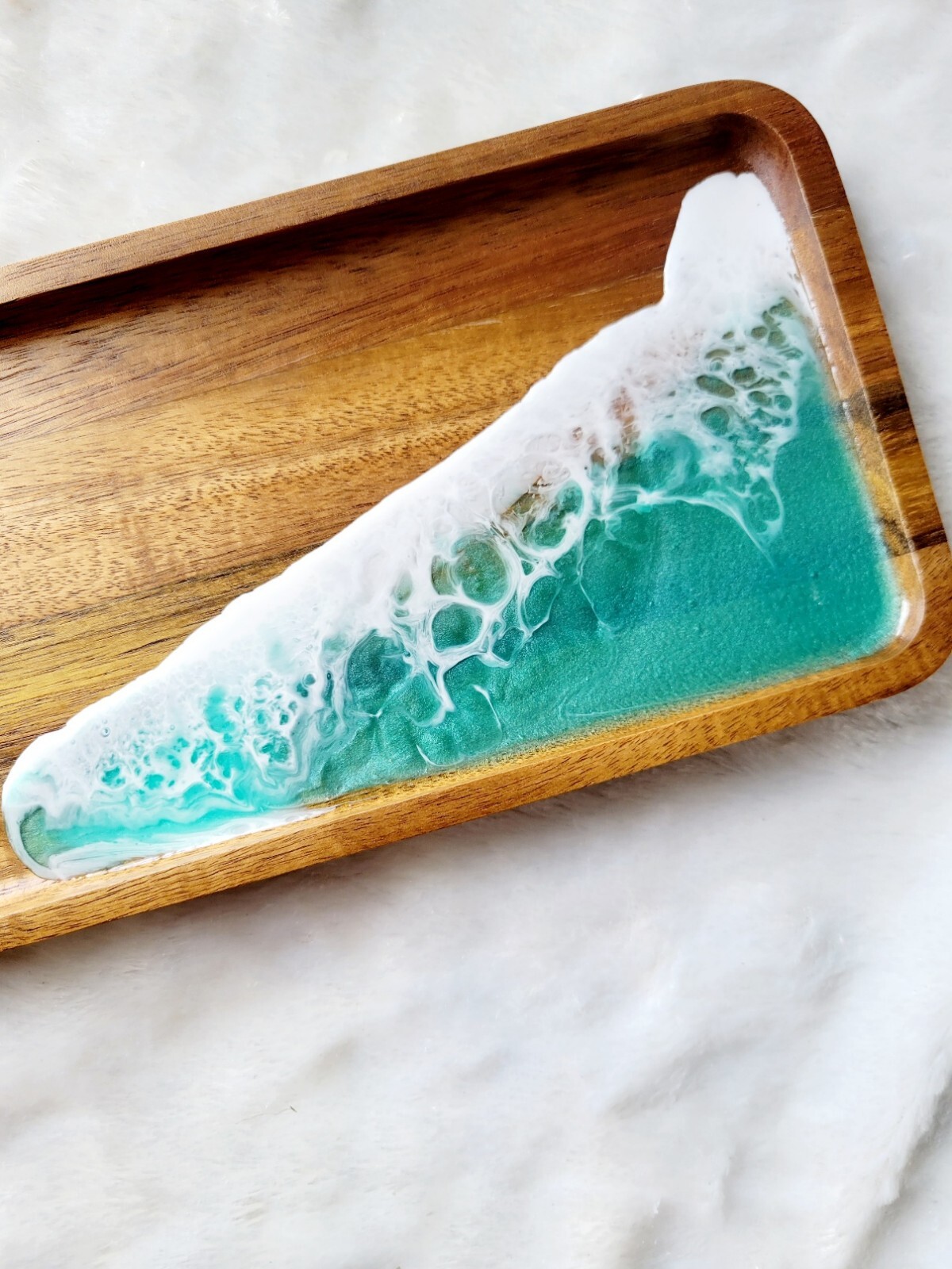 Add flair to your decor with this elegant, acacia accent tray. This beautiful display tray is perfect for any space. Can be used as a perfume tray, cosmetic organizer, candle holder, soap dish, jewelry dish etc. Food Safe Non-Toxic resin has been used. Care: Wipe down if needed. Dimensions: 5" x 12" x .75" Made to order. Processing time 5-7 days. If in stock, item will ship right away.
