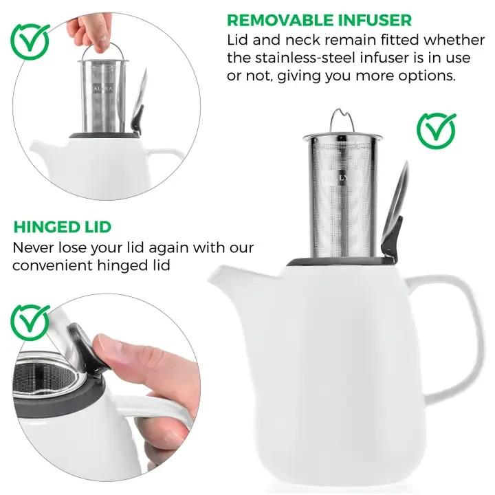 The Tealyra Daze Ceramic Teapot is a stylish and practical addition to any tea lover's collection. Made from high-quality ceramic, this teapot boasts a generous 47oz capacity in a sleek white color. The Tealyra brand is known for its quality and craftsmanship, making this teapot both durable and elegant for serving tea in any home or garden setting. - Dishwasher safe - Heat resistant to 120C/240F - High-fired ceramic, Lead-free glaze - Removable stainless steel infuser - Capacity: 47oz / 1400 ml The box is opened but never used.