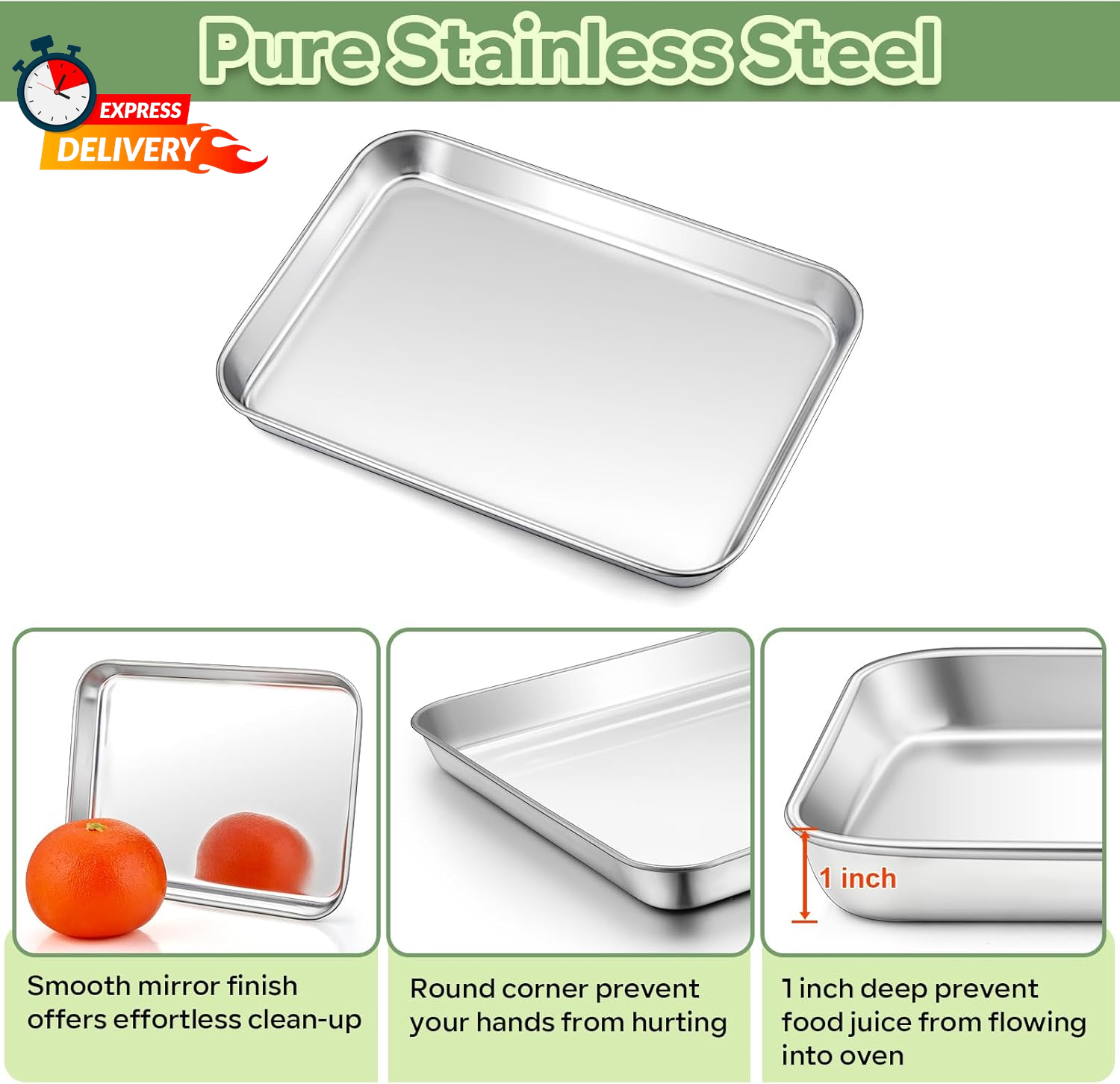 Store New Arrivals Add to Favorite View Feedback Contact Teamfar Toaster Oven Pan with Rack Set, 9’’ X 7’’ X 1’’ Stainless Steel Compact Toaster Oven Small Baking Pan Tray with Mini Cooling Grid Rack, Healthy & Heavy-Duty, Dishwasher & Oven Safe, 2Pcs Description Color Silver Brand TeamFar Material Stainless Steel Is Dishwasher Safe Yes Item Weight 0.44 Kilograms Product Dimensions 9"L x 7"W x 1"H Size 9"x7"x1" Healthy & Heavy-Duty: Toaster oven pan with cooling rack are made of pure stainless steel without any toxic or chemical materials, No worry about toxic coating flaking off into your food, No rusty and deformation resistance, With thick gauge and sturdy construction for using longer time Toaster Oven Pan: The toaster oven tray is 9’’ x 7’’ x 1’’, Fits for most toaster oven, Smooth edges without sharp spot prevents from hurting your hands and pick up comfortably, 1 inch deep sides with roll edge helps avoiding food juice or grease spilling out, Keeps your oven clean Cooling Grid Rack: The 8.75’’ x 6.25’’ cooling rack with dense lines and 0.6” small grid spaced pattern to avoid the small food falling, 4 thick supporting feet raised the entire rack up by 0.75 inch, Allows air to circularly flow for baking food better, Welded firmly and 2 cross bars strengthen the stability of the rack Multi-application: A great replacement mini baking pan with rack set fits for small amount of cookies / breads/ meats / vegetables making, Helping you to deal with the personal baking tasks easier in the daily use, The baking rack not only be used with baking pan, but also can hold and cool the food separately after baking Easy to Clean: Mirror polished surface reduces the possibility of sticking on the pan, Allows the food be released easily without sticking, Makes cleaning task more effortless, Both broiler pan and wire rack are effortless clean and dishwasher safe to save your labor and time TeamFar 9’’ x 7’’ x 1’’ Stainless Steel Toaster Oven Pan Tray Small Baking Pan with Cooling Grid Rack Wire Set of 2, are made of pure stainless steel without toxic coating or chemical materials, healthy for daily use. Not only ideal for baking cupcakes, vegetables, bacons, but also be used as serving tray, cookie tray, cooling rack and etc. Both baking pan and cooling rack are dishwasher safe. Specification: Material: Pure Stainless Steel Craft: Mirror Finish, Sturdy Construction, Smooth Edge, 1 inch Deep Side Features: Healthy, Easy to Clean, Dishwasher Safe, Oven Safe Dimension: Pan: 9’’ x 7’’ x 1’’ Rack: 8.75’’ x 6.25’’ x 0.75’’ Why Choose TeamFar Stainless Steel Toaster Oven Pan Tray with Grid Rack? 1. Non-Toxic - Made of pure stainless steel without any toxic substance into your food, Healthy for daily use. 2. Heavy Duty – Sturdy and rust resistance, Feel solid and not easy to smash. 3. Smooth - Shiny and attractive mirror finish, Roll edges and round corners to comfortably hold and transfer conveniently. 4. Baking Evenly - 4 x 0.75 inch supporting feet raise the rack up for better air circulation to make the food baked evenly. 5. Multipurpose - Baking trays and racks not only be used together, but also separately used. For baking cookies, jelly rolls, meats, vegetables, Racks for cooling/ decorating food. 6. Dishwasher Safe - All the pan and rack are dishwasher safe. Using Instruction: 1.Please wash the pan and rack with warm soapy water before your first using. 2.Please hand dry them after cleaning, stored in dry place for durability. 3.Please avoid sharp and rough tools to scratch the shiny surface of the pan. 4.Dishwasher safe. ABOUT US We offer the best prices around on high quality products. Our E-store includes media such as books, movies, music and games while offering electronics, toys, sporting apparel, clothing, tools, general home, garden items and more. SHIPPING We are always working hard to ensure your package arrives as soon as possible. Please understand that some factors like weather, high postal traffic, and the performance of shipping companies are outside of our control. We offer free shipping to the lower 48 states and ship within 2 business days of payment, usually sooner. We do not accept P.O. Boxes. Please provide a physical address. For shipping outside of the continental USA, we only use eBay's Global Shipping Program.The item is shipped to KY and then sent to the rest of the world. International customers are responsible for all duties and taxes. Continue to check out in order to calculate costs for shipping the item to your country. Messages regarding eBay's Global Shipping Program MUST be directed at eBay EXCLUSIVELY. RETURNS We offer a 30-Day Return Policy on items which you are not completely satisfied with. You have the option for a full-refund or an exchange of the item. No returns are available on items shipped outside of the USA. PAYMENT We accept PayPal. CONTACT US This page content is yet to come Please ad us to your favorite seller and visit again later Thank You CUSTOMER SATISFACTION We try our very best to make sure every customer is completely satisfied. If there's a problem, message us! We're happy to help. WE ACCEPT Copyright © 2021 AutoDS. | All Rights Reserved