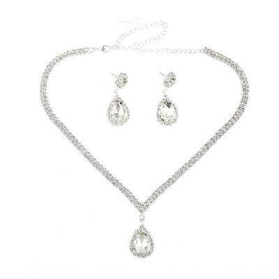 Store Home | Home & Garden | eBay Motors | Business & Industrial | Computers/Tablets & Networking | Consumer Electronics | Crafts | Pet Supplies | Clothing, Shoes & Accessories | Cell Phones & Accessories | Jewelry & Watches Teardrop Rhinestone Jewelry Necklace Earring Set Wedding Party Costume Description : Beautiful and elegant , diamante necklace with matching earrings This delicate jewelry set used high quality sparkling rhinestones , brings you gorgeous and charming Ideal for wedding , banquets , prom or any other special occasions Specification : Material : Alloy , rhinestone Color : Silver Necklace length : Approx 37 - 53cm / 14 . 6 - 20 . 8 inch ( adjustable ) Earring length : Approx 4 . 5cm / 1 . 77 inch Earring style : Piercing Package Includes : 1 Piece Necklace 1 Pair of earrings Note : Since the size above is measured by hand , the size of the actual item you received could be slightly different from the size above . Meanwhile , please be reminded that due to lighting effects , monitor 39 ; s brightness / contrast settings etc , there could be some slight differences in the color tone of the pictures and the actual item . Shipping And Handling Policy People always bought together with