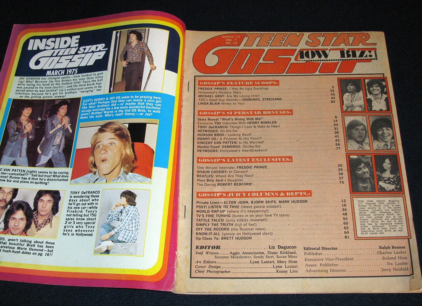 Teen Gossip Magazine March 1975 - Normal wear on cover - Cover is attached Pinups of : Brett Hudson, Donny Osmond, Vincent and Michael Gray Features on : Osmonds, Linda Blair, Henry Winkler, Tony DeFranco, Freddie Prinze, Shaun Cassidy, Hudson Brothers, Donny Osmond, Vincent and Michael Gray, The Beatles - where are they now, Osmond TV Special, Robert Redford, The Heywoods, Brett Hudson ** Page 3/4 Article has part of Osmond headline cut out ** Page 21/22 Page is missing - not sure what was on it. inkfrog terapeak