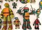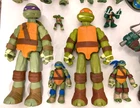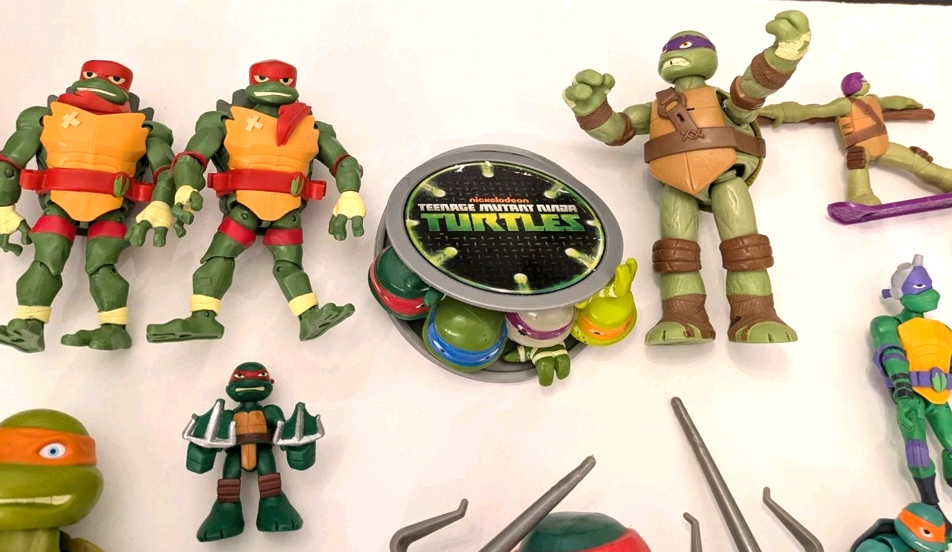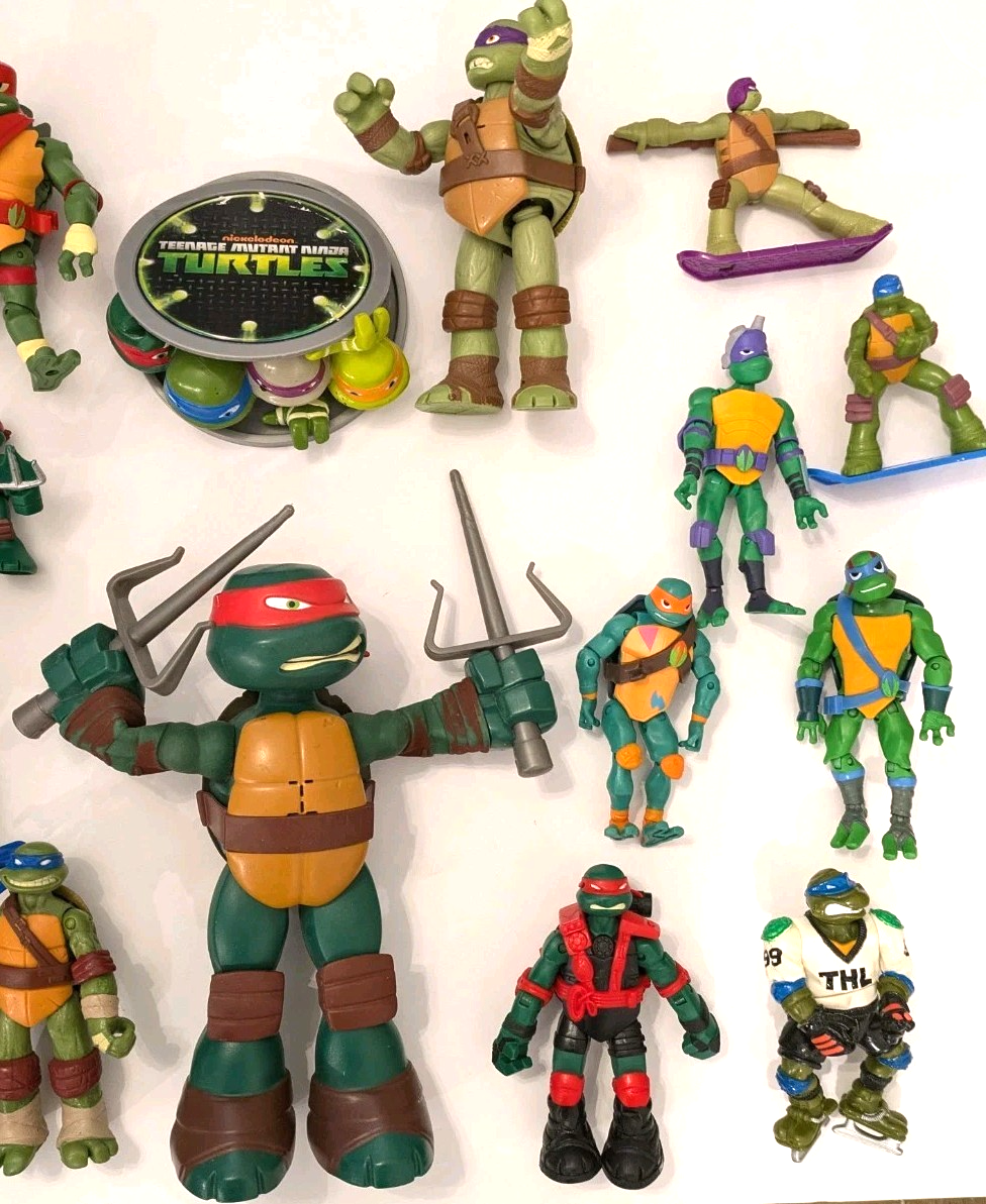 The TMNT Teenage Mutant Ninja Turtles 10” Action Figures Toys by Playmates Viacom are a collectible lot of characters like Raphael and Donatello from the popular TV show and movie franchise. The tallest of these green plastic figures stands at 10 inches tall .6 of the figures are made by Playmates and are perfect for fans of all ages. With their iconic turtle design and martial arts theme, these action figures are great for imaginative play or display as part of a TMNT collection. These figures stay true to the original Teenage Mutant Ninja Turtles series, appealing to both old and new fans of the franchise.Most are in really great condition,as pictured.
