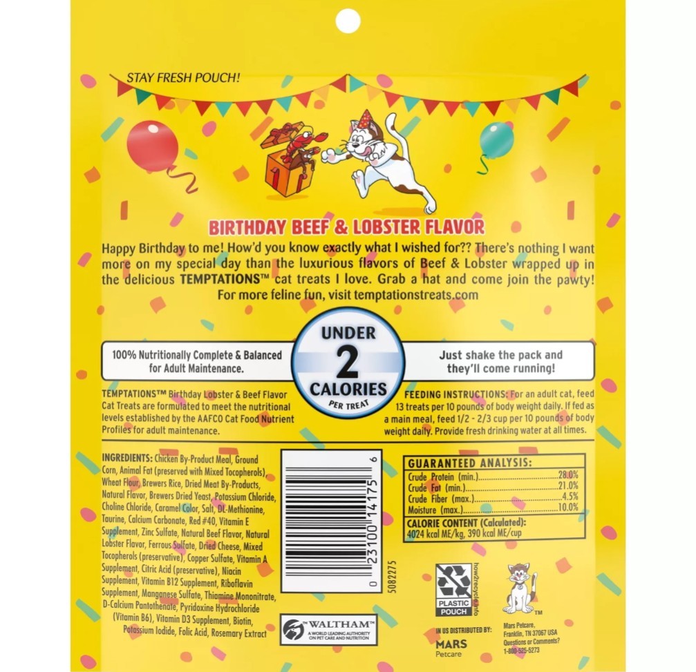 Treat your cat to the savory goodness of TEMPTATIONS Birthday Crunchy Soft Treats, a perfect blend of beef and lobster flavors that cats of all sizes love. Each pack provides a delightful mix of crunchy exterior with a soft interior, satisfying your pet's texture cravings and taste buds with a flavorful twist that celebrates their birthday. Designed by Mars Petcare, these treats are ideal for adult cats, ensuring a tasty reward without any added colors, preservatives, or artificial flavors. The convenient 6.3 oz size makes it easy to portion out, keeping your feline friend happy and healthy. The product dimensions are a compact 1.26 x 6.26 x 7.24 inches, making it a space-saving addition to your pet's snack cabinet.