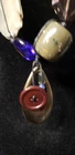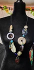 This Teresa Goodall Boho Necklace is a vintage-inspired piece handcrafted with a round donut-shaped pendant, teardrop aluminum pendant, and adorned with 33 multicolored & multishaped resin, acrylic, and glass beads. The necklace has a length of 25 inches and features an adjustable tie closure that you can tie to make it shorter. The earthtones & blues colors and bohemian theme make this necklace suitable for any occasion, adding a unique and artful touch to your outfits. This signed piece showcases Teresa Goodall's unique style and artistry, perfect for those looking for a statement accessory with a touch of boho charm. This necklace blues colorways looks great with all your linen, white, and denim outfit looks!