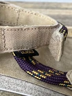 The Teva Original Universal Rope Leather Sandals are a women's shoe with a flat heel under 1 inch. They are a strappy style sandal with adjustable straps and a hook and loop closure. The sandals are made of leather with a synthetic lining and rubber outsole. They feature cushioning for comfort. From a smoke-free home. BOX S4