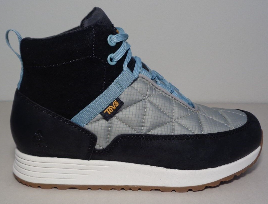 Teva Size 7 M REEMBER COMMUTE WATERPROOF Black Grey Boots New Women's Shoes New without box Style: REEMBER COMMUTE WATERPROOF, 1134690 Color: BCKG, Black/Grey - Elevate your streetwear style in the Teva ReEmber Commute Waterproof boots - Featuring the same luxe leather and waterproof versatility as the much-loved Ember Commute -Earth-conscious update elevates the original with recycled ripstop, EVA, and rubber -Commuter-friendly closet staple -Best for: all weather city wear, all-day wear, getting around town, relaxing at the campground, wearing with socks -Features: *TevaRapid Proof: W aterproof materials, plus waterproof bootie construction below the ankle *Waterproof Membrane Bootie Construction, L eather, and S uede * Sustainability Initiatives: Leather sourced from tanneries certified by Leather Working Group, whose mission is to promote sustainable and appropriate environmental business practices within the leather industry, Recycled polyester, Regrind outsole, Regrind midsole, Webbing made from recycled plastic using traceable, verifiable REPREVE polyester yarn by Unifi *Partially recycled materials *Non wicking materials -Leather and textile cush quilted upper -Mix of leather and suede for premium style and comfort, Adventure-ready, non-wicking 100% recycled ripstop upper inspired by classic outdoor gear -Gusseted tongue with water repellent coating - Traditional lace-up closure offers a secure fit -Classic round toe silhouette - Pull tab in back for easy on and off access - L ined with lightweight, breathable, and 43% recycled polyester mesh that keeps your feet cool and comfortable -Treated with Life Natural, a peppermint-based anti odor treatment -R esponsive cushioned removable footbed cushions your foot and puts a spring in your step -Padded tongue and collar for added support - 30% recycled EVA midsole provides maximum, lightweight comfort -Rugged Durabrasion Rubber outsole with 30% recycled content stands up to abuse with great traction -Weight per boot 13 oz -Top to bottom(measured at heel) 5 inches -Heel height 1 inch -Shaft height 4 inches -Top to bottom(measure at highest point-above laces) 5.75 inches -Eur 38 / UK 5 / JPN 24