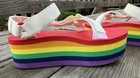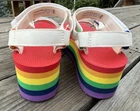 Teva Sandals Women’s size 7 Flatform Universal Rainbow Stripe Pride White Platform Adjustable straps Good pre-owned condition - minor marks, normal wear on outer soles