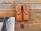 New old stock Tex Shoemaker brown basketweave, white stitched double magazine carrier. Carrier holds 2 GLOCK 19, 23 or 32 magazines. This mounts horizontally on a belt up to 1 3/4". This was a special order item due to the slot size. This is new old stock with light storage wear. Please look at photos as this is the item you will receive.. Please look at the photos and ask any questions you have. Listings may have other items in photo such as ammo, pistols, magazines, catalogs, cartridges, Belts, cuffs or any other item not directly mentioned and described is used as a photo prop are not included with your purchase. But if you are unsure please ask before purchase. Consider checking out our other listed items and follow this store. We have over 3000 holsters and accessories most vintage or hard to find. We also have a large selection of duty gear and accessories for patrol. We are constantly updating our store with new hard to find Vintage leather. We ship usually the next day and have excellent customer feedback. Thank you and stay safe..