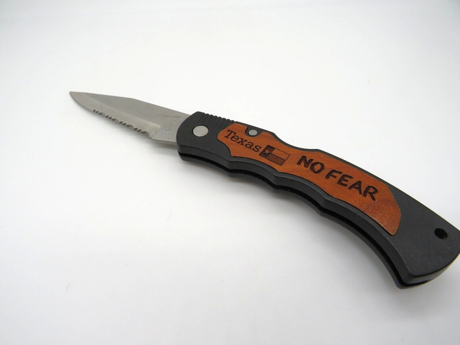 Texas No Fear Pocket Knife No Box Serrated Blade Clip on Thanks for Looking Please review photos closely. Message me with any questions you have.