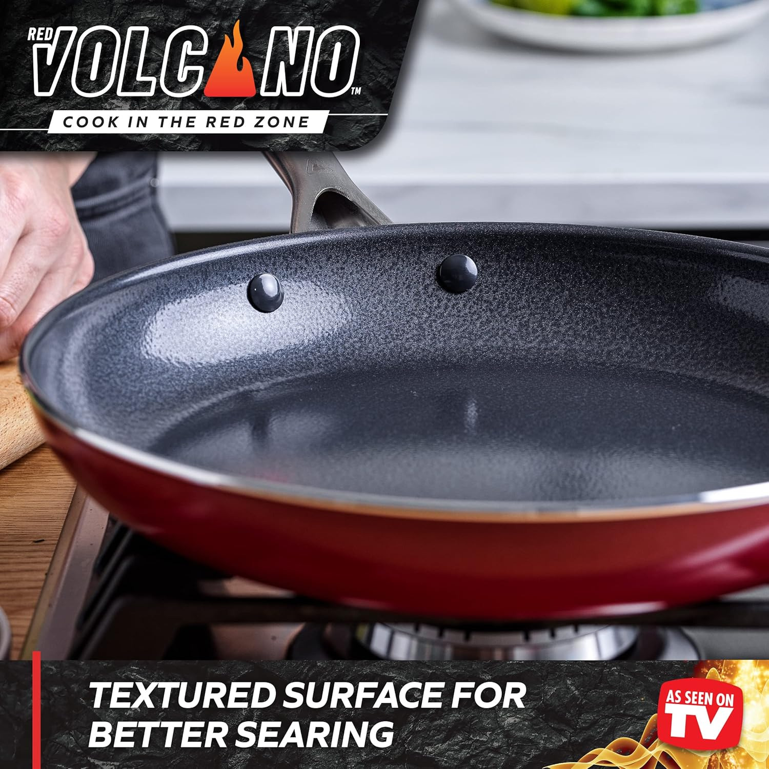 Set includes: 2QT and 3QT saucepans with lids, 5QT stockpot with lid, 7-inch frypan, 5.5-inch frypan, 2.78qt sauté pan with lid Go with the Flow: Unique Lavaflow technology fuses ceramic nonstick with plutonic rock. Plutonic rock is a dynamic substance formed by unbelievable heat and pressure that can stand temperatures up to 1400°F! Cook in the Red Zone: Red Volcano’s textured nonstick spreads oil evenly for better frying, plus it’s 10x longer lasting and heats 5x faster than traditional coatings Toxin-Free: Free of PFAS, PFOA, lead, and cadmium Made from heavy-gauge aluminum for quick and even heating Oven and broiler safe to 600°F; glass lids 425°F Dishwasher safe for quick and easy cleanup For this set, we’ve reached into the depths of the Earth to harness nature’s power. Red Volcano uses Lavaflow technology to fuse ceramic nonstick with plutonic rock, a dynamic substance formed by unbelievable heat and pressure. Each pan has a textured nonstick coating that spreads oil evenly for better frying, plus it’s 10x longer lasting and heats 5x faster than traditional coatings! Incredibly strong and long lasting, plutonic rock can even stand temperatures up to 1400°F! This unique coating is specially designed to transfer heat quickly for unbelievable searing and browning, plus the texture enhances nonstick performance. Free of PFAS, PFOA, lead, and cadmium, this coating is toxin-free so you can cook with worry. Designed for daily life, these pans are metal utensil safe. Heavy-gauge forged bases keep these pans from warping and wobbling. Dishwasher safe for easy cleanup. Cook in the red zone! Set includes: 2QT and 3QT saucepans with lids, 5QT stockpot with lid, 7-inch frypan, 9.5-inch frypan, 2.78qt sauté pan with lid