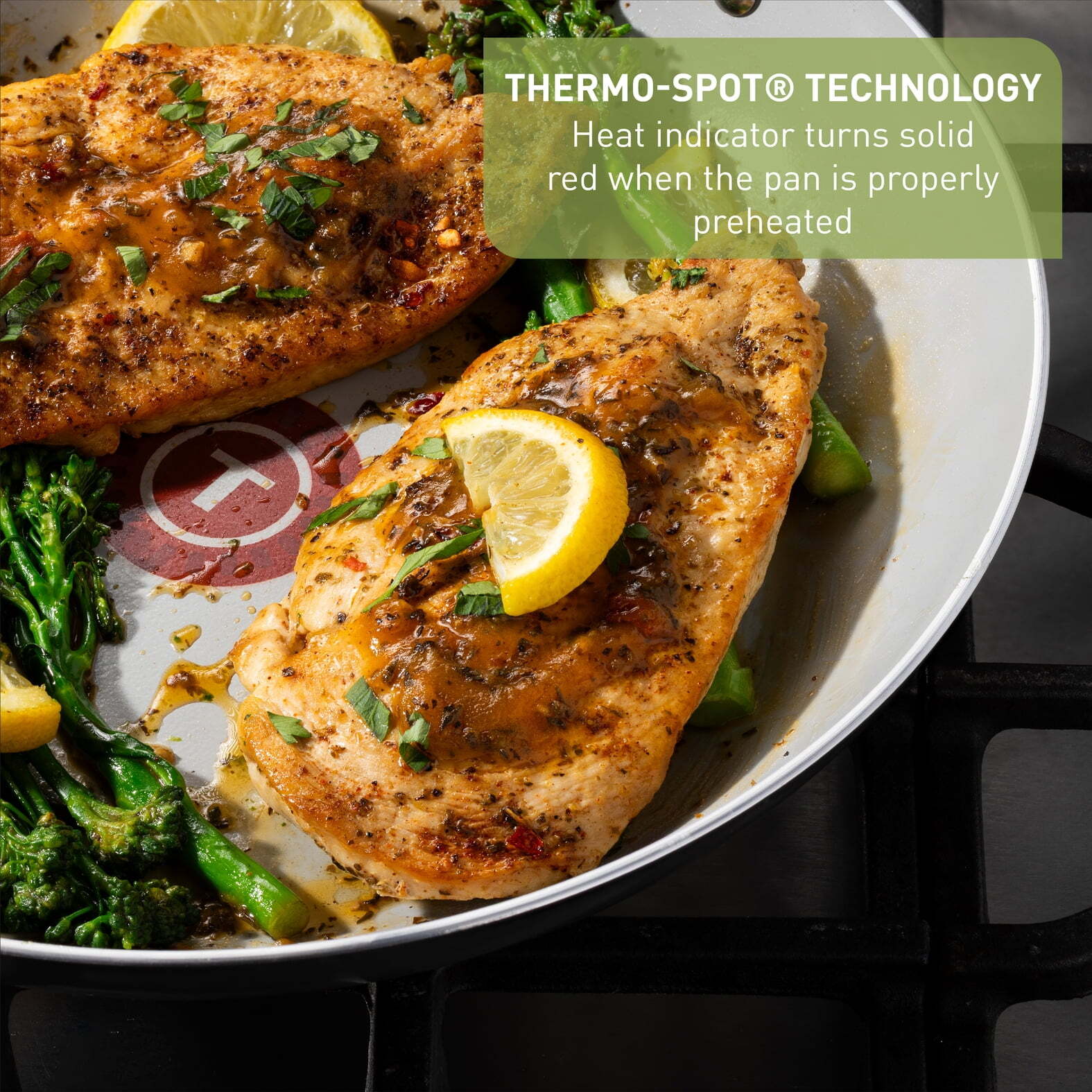 Add a touch of color and style to your kitchen with our T-fal Easy Care Ceramic 8 and 10.5 Inch frypan set. Crafted with a 100% recycled aluminum body and a ceramic non-stick interior, you can reduce your eco-impact and enjoy healthy and delicious meals. The Thermo-Spot® Technology lets you know when the pans are perfectly preheated, so you can cook with confidence every time. Designed with comfortable handles that provide a secure and sturdy grip, and an even heat base that heats up quickly and prevents hot spots, this cookware is both functional and stylish. It is versatile enough to be oven safe up to 350°F. Add a touch of color and style to your kitchen with this ceramic collection. T-fal 8 and 10.5" Easy Care Ceramic Nonstick Frypan, Set of 2 Healthy cooking with reduced eco impact: Crafted with 100% recycled aluminum body and a ceramic nonstick interior, allowing you to prepare nutritious meals with little or no oil Includes two versatile frypans: 8 inch and 10.5 inch, perfect for browning, searing, and pan-frying a variety of foods including eggs, vegetables, and meats Thermo-Spot Technology®: Unique heat indicator turns solid red when the pans are properly pre-heated, ensuring optimal cooking results without hot spots Stylish and practical design: Adds a touch of color to your kitchen with comfortable handles for a sturdy and secure grip Effortless cooking and easy cleanup: Compatible with all cooktops except induction, oven safe up to 350°F, and recommended for hand washing